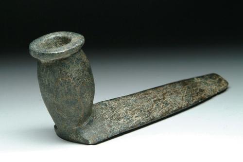INTRUSIVE TYPE MOUND PIPE. Black steatite. Late Woodland, Circa 700-900AD style. SIZE: 8in. l x 3-1/2in. h. CONDITION: Very good. 9-25984-13 The Tennessee Collection of Prehistoric Indian Artifacts from the Allen Graves Estate. SPECIAL NOTE: We do not regularly sell Prehistoric Indian stone artifacts and therefore have very little experience and no expertise in this area. All of the following lots have come from the Collection of the Late Allen Graves of Tennessee. The collection was inherited some years back by his daughter, who now lives in Maine. This collection was consigned to us directly from her. We employed someone to generally identify styles and types, but as stated above, due to our lack of expertise in this field, we can not guarantee the age or origin of the following pieces. We are relying on you, the buyer, to determine to your satisfaction the origin and age of each item in the collection.