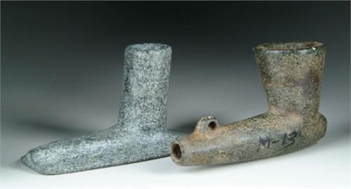 INTRUSIVE TYPE MOUND STYLE PLATFORM PIPE AND CONTACT PERIOD ELBOW PIPE. Both are soapstone. Age unknown. SIZE: Both approximately 4-3/4in. l x 2-3/4in.. CONDITION: Very good. 9-25984-43 The Tennessee Collection of Prehistoric Indian Artifacts from the Allen Graves Estate. SPECIAL NOTE: We do not regularly sell Prehistoric Indian stone artifacts and therefore have very little experience and no expertise in this area. All of the following lots have come from the Collection of the Late Allen Graves of Tennessee. The collection was inherited some years back by his daughter, who now lives in Maine. This collection was consigned to us directly from her. We employed someone to generally identify styles and types, but as stated above, due to our lack of expertise in this field, we can not guarantee the age or origin of the following pieces. We are relying on you, the buyer, to determine to your satisfaction the origin and age of each item in the collection.