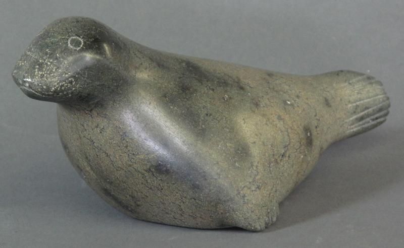 - dark greenstone carving of a seal by Samonie Toonoo (b.1969), Cape Dorset. Paper label at base.
