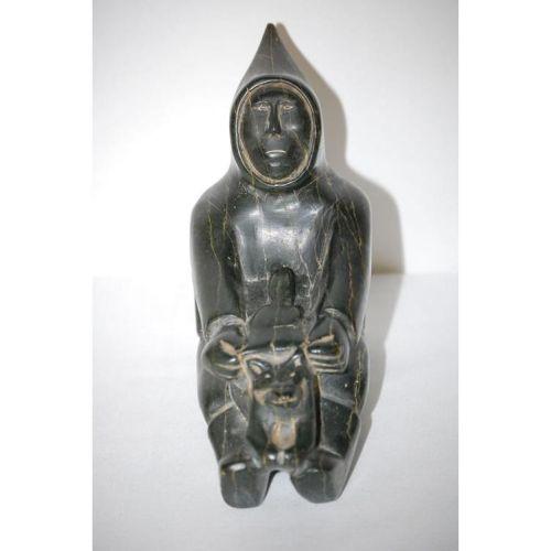 INUIT ESKIMO FIGURAL STONE CARVING DEPICTING A HOODED HUNTER W/ AN ANIMAL IN HIS LAP-CARVED IN A SOFT GREEN STONE W/ CREAM COLORED VEINS, UNMARKED (6 3/4" T X 8" L X 3 1/2" W) - WEAR, IMPERFECTIONS