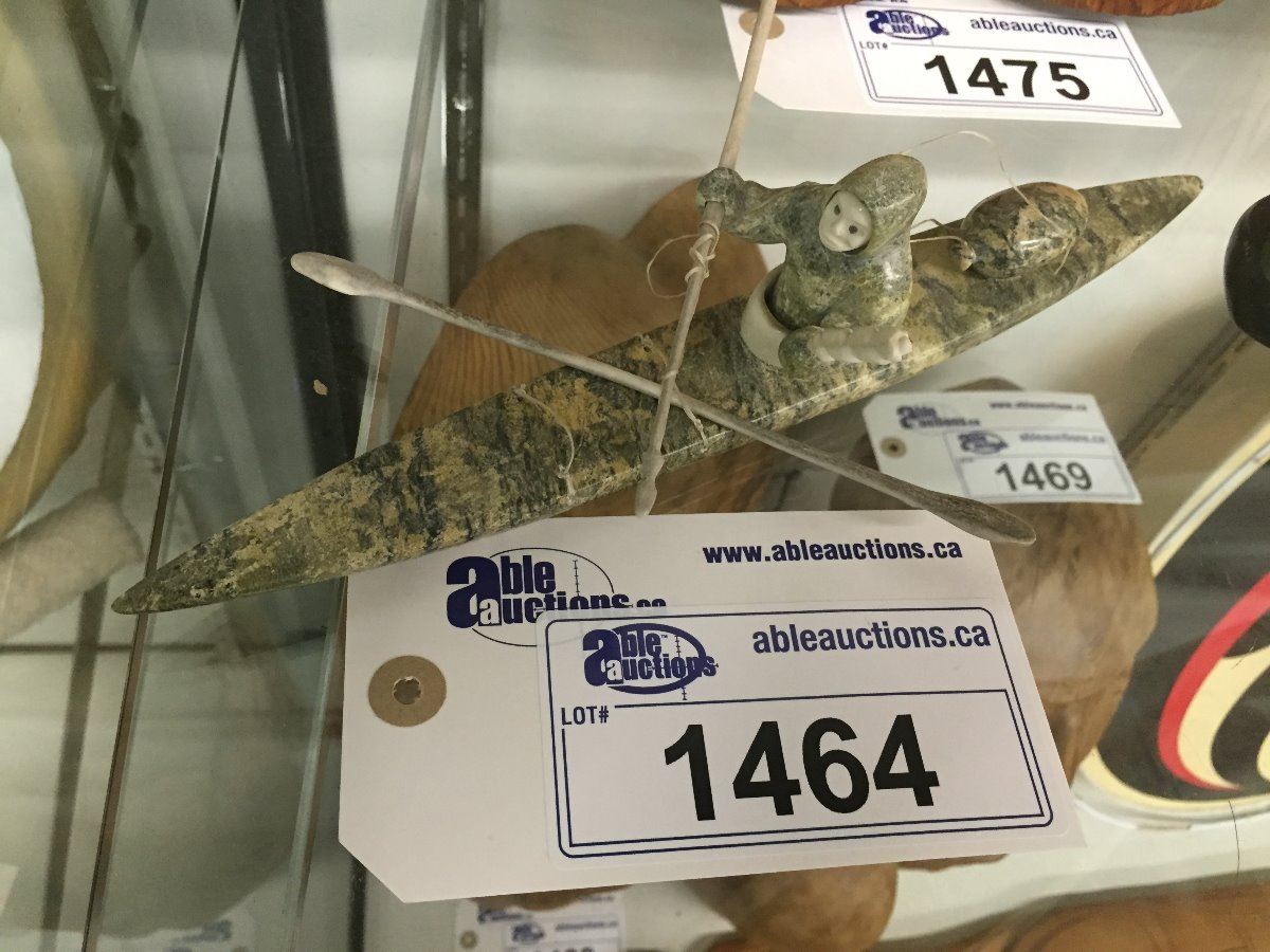 INUIT STONE CARVING OF A HUNTER IN KAYAK WITH SPEARS 11.5  L X 3  H