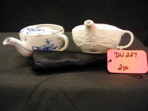 INVALID FEEDERS, TURN OF THE CENTRY, SEMI PORC. INCLUDES (1) GERMAN DELFT (W/ STRESS CRACK ON HANDLE DOES NOT GO THRU TO BODY), (1) UNMARKED W/OVERALL BOW GARLAND RELIEF EXCELLENT, 2 PC