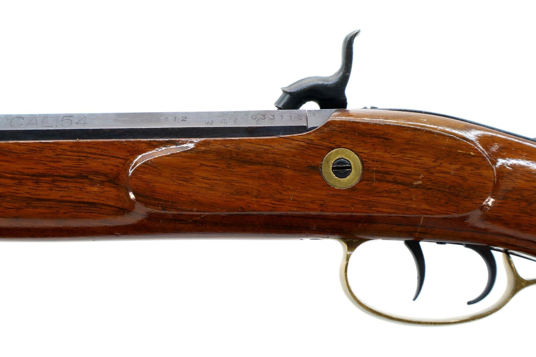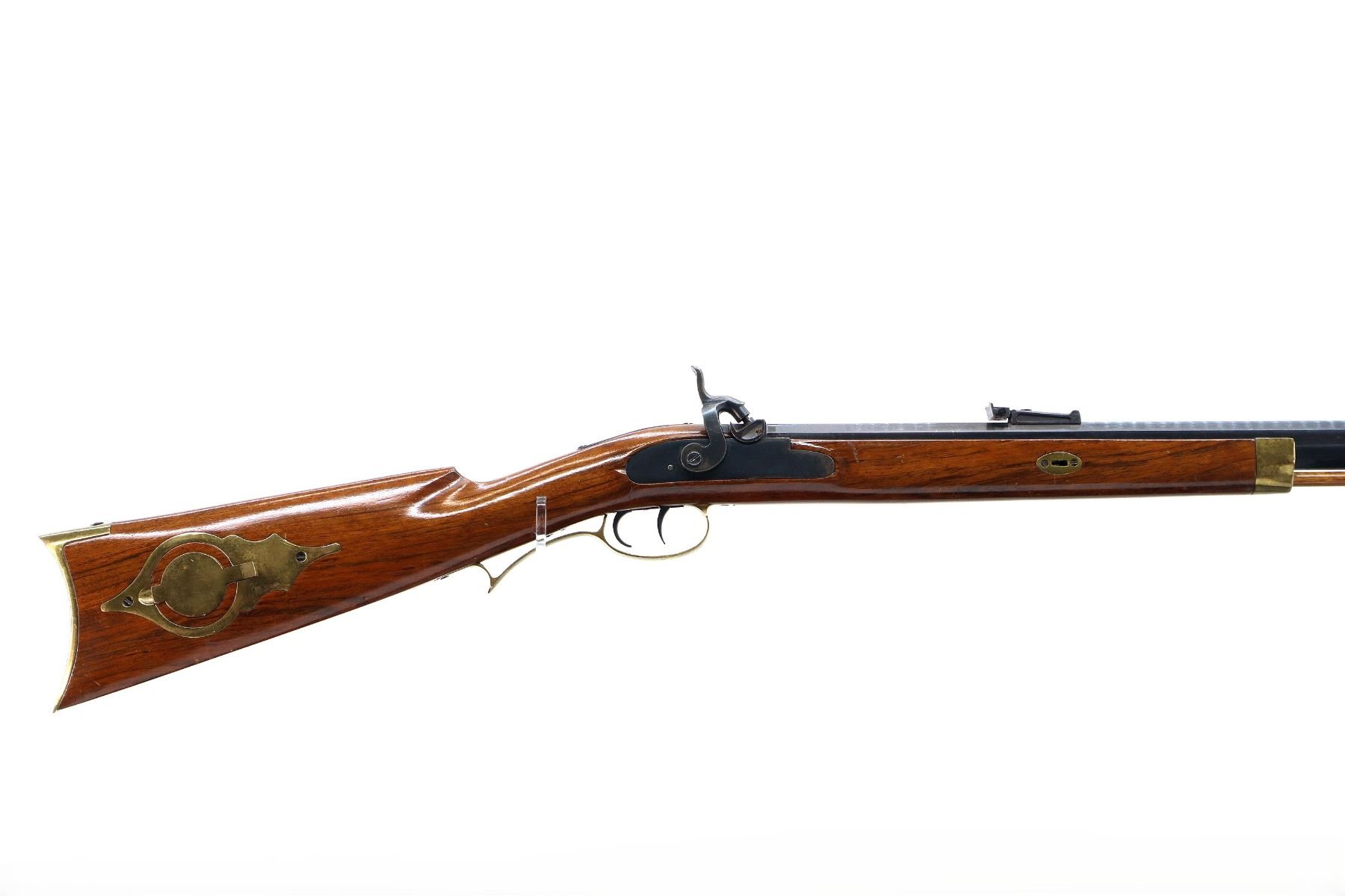Main Description: Blade front sight, adjustable u notched rear sight, blued octagon barrel, smooth lock with grooved spur hammer that functions, mainspring is slightly weak. One piece half length wood stock, missing forearm wedge, straight grip cracked on left side behind barrel, cheek rest, smooth curved brass butt plate, patch box, finger rest trigger guard and nose cap. Wood ramrod with brass tip.