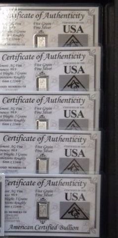 INVESTOR BULLION - .9999 FINE SILVER - 5 GRAIN WITH ASSAY CARD - AMERICAN CERTIFIED BULLION - 5 PER LOT