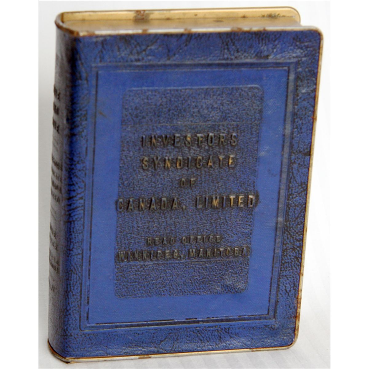 INVESTORS SYNDICATE OF CANADA LIMITED. Head Office/Winnipeg, Manitoba. ‘Save and Have/Benjamin Franklin/Made in U.S.A… Vol. 5’ on spine. Hole on bottom. Key lock. No key present. No serial number. 9cm x 12cm x 2 1/2cm. Blue cloth or leatherette cover. Maker-The Zell Co., N.Y. Patent pending. Fine+.