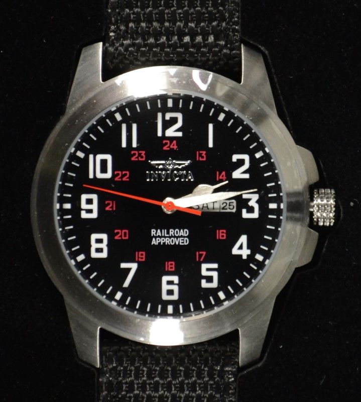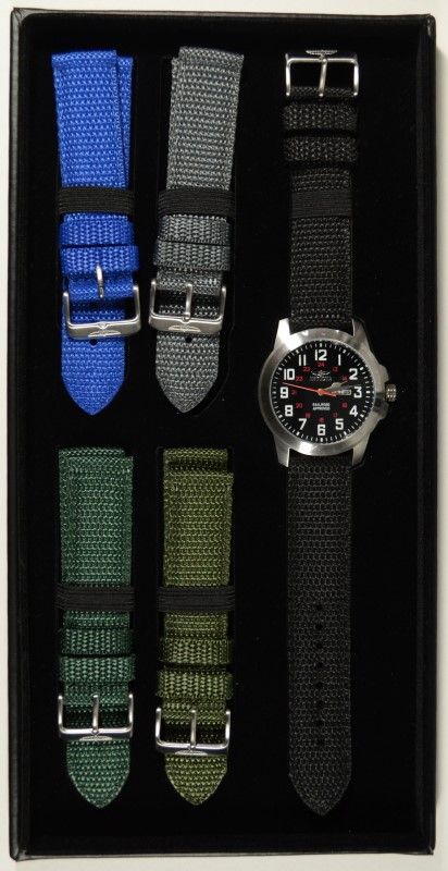 Stainless Steel Case, Japan Movement, Rail Road Approved! 50m Water Resistant, Includes Five cloth bands in blue, grey, black, & two green. Est $250-$275.