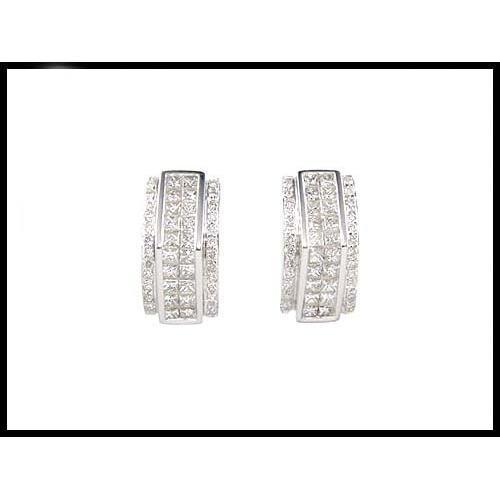 18K white gold earrings are set in the invisible style (no prongs) with 40 excellent quality princess cut diamonds that weigh .93 carats, and 48-prong set, full cut diamonds that total another.25 carats. They measure 8mm (5/16") wide x 15mm (5/8") long. There is fantastic sparkle from these exquisite and elegant earrings.