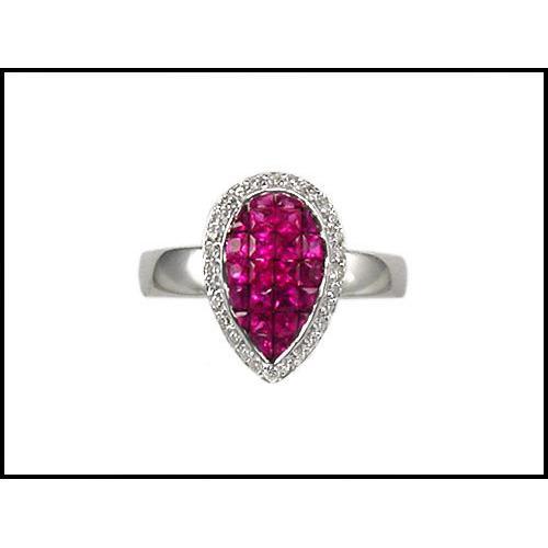 A wonderfully made 18K solid white gold ring is set with highly brilliant natural rubies that are set in the invisible style (no prongs). Only highly skilled gem setters are capable of such work The border of 28 round white diamonds creates perfect contrast. The ring measures 15mm x 10mm (9/16" x 3/8"). Size 7 is very easy to change up or down. Tag price was only $1,000.00, but you may own it for even much, much less.