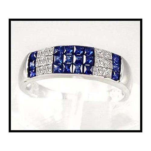 Collection color natural sapphires of high brilliance are combined with 12 excellent princess cut diamonds in 18K white gold. Only highly skilled craftsmen are qualified to do invisible setting (without prongs), and this is the work of a master. It measures 5mm (3/16") wide. Size 7 1/4. Was priced for $800.