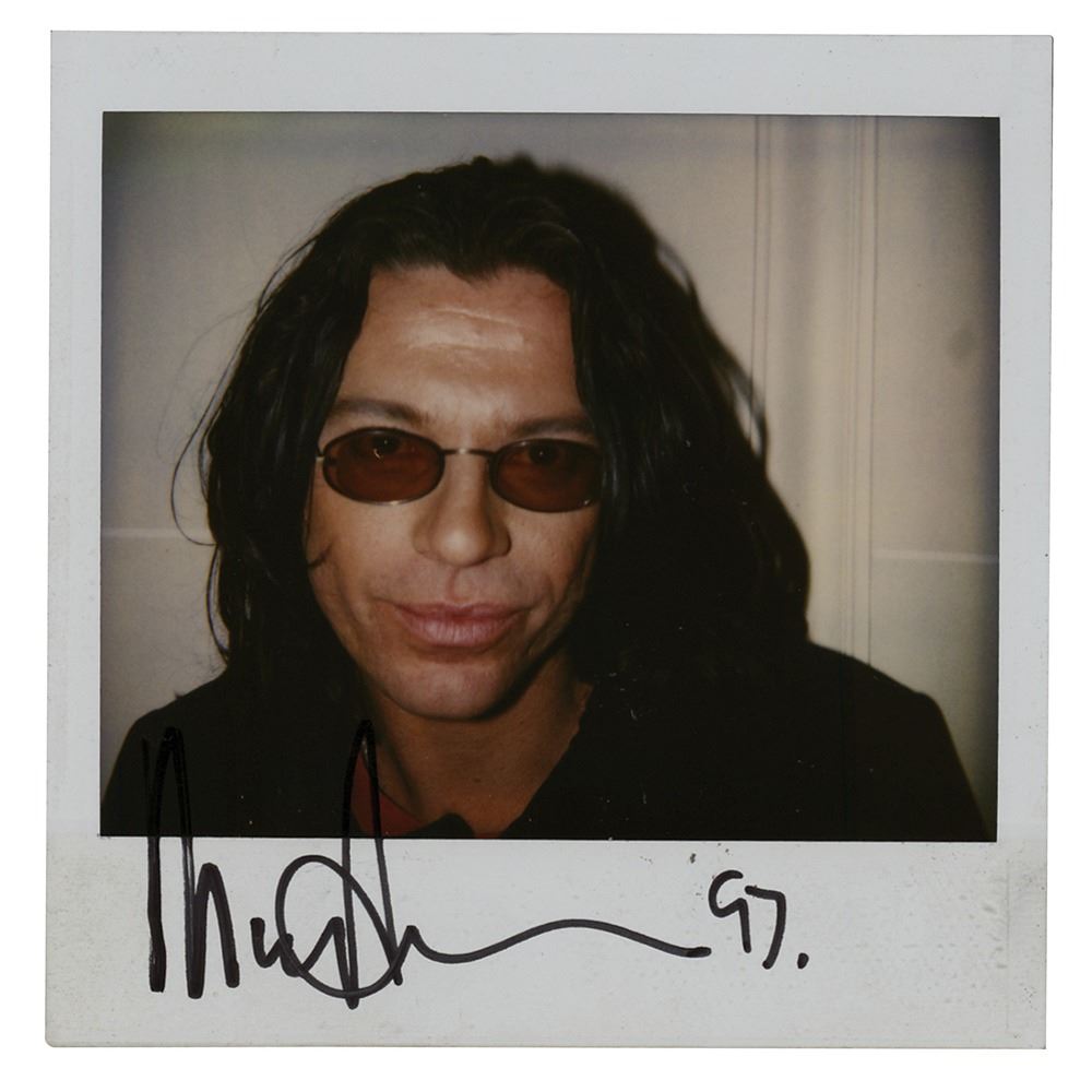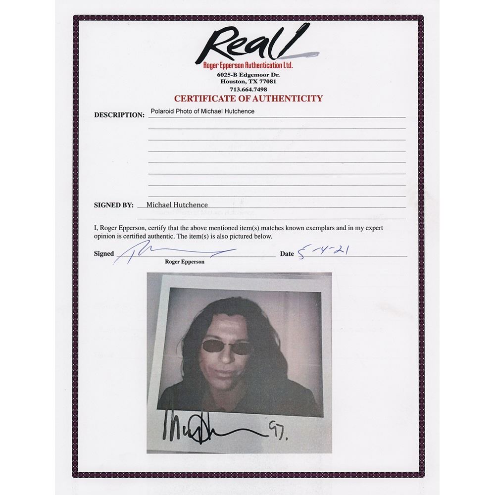 One-of-a-kind original color glossy 4 x 4 Polaroid photo of INXS frontman Michael Hutchence smiling and wearing glasses in a candid up-close pose, signed in the lower border in black felt tip, “Michael Hutchence, 97.” In fine condition. Accompanied by a full letter of authenticity from REAL. The consignor notes that this photo was signed/taken a few months before the singer's untimely death.