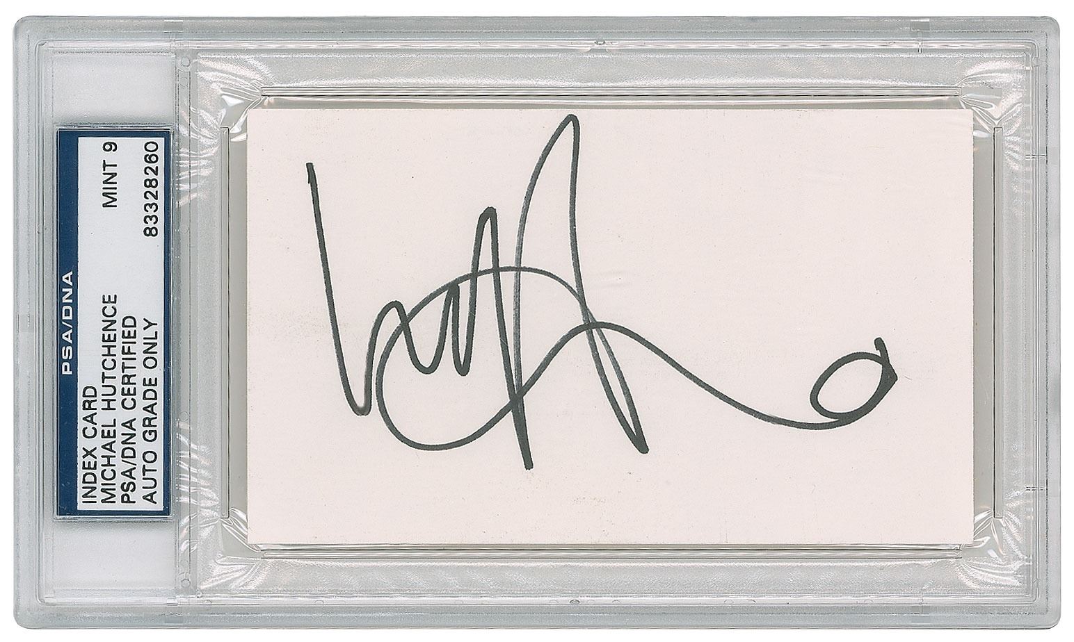 Felt tip signature of INXS frontman Michael Hutchence on a white 5 x 3 card. In very fine condition. Encapsulated by PSA/DNA, with the autograph graded MINT 9.