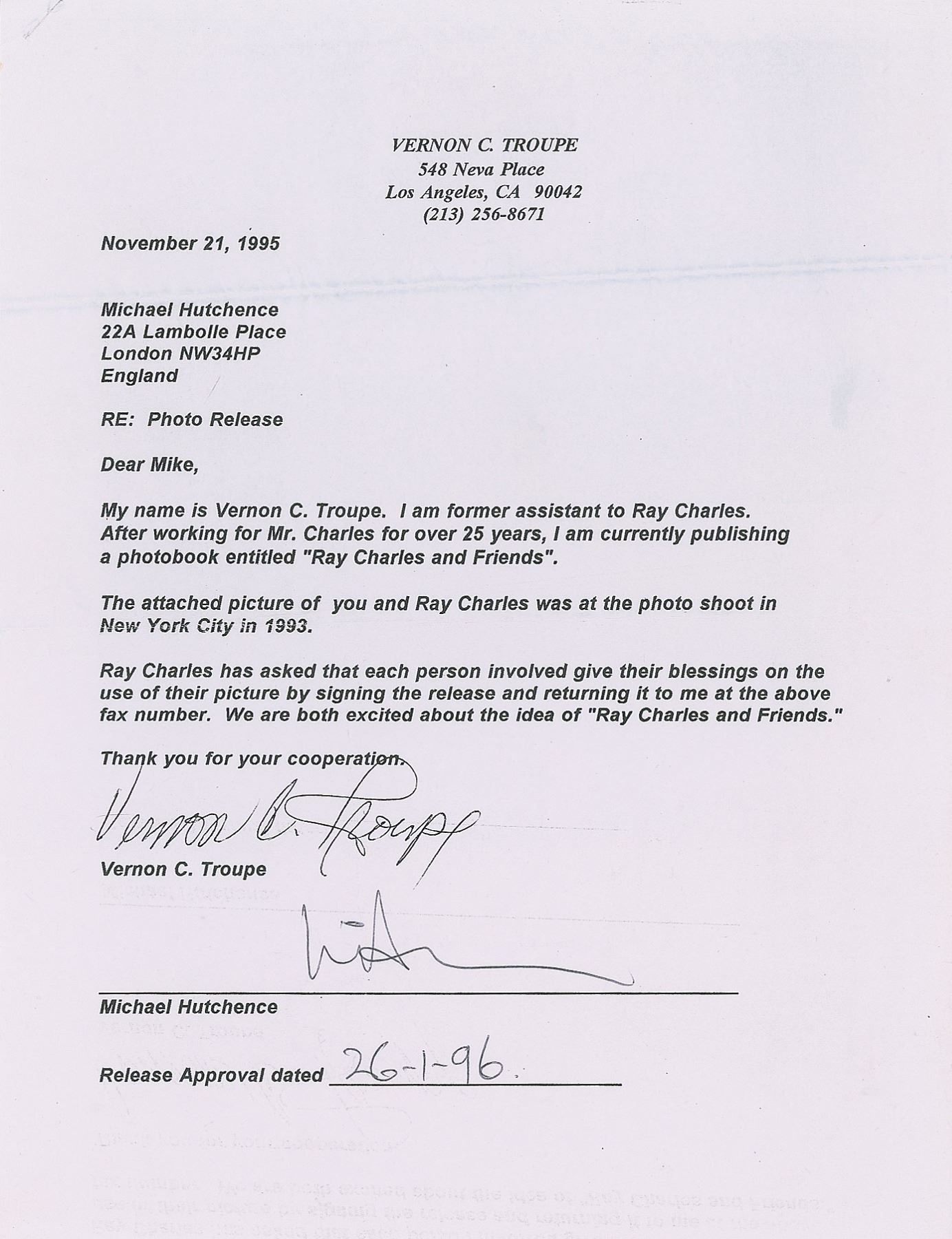 DS, one page, 8.25 x 10.75, January 26, 1996. Hutchence grants permission to publish a photograph of himself and Ray Charles for a photobook entitled "Ray Charles and Friends." In fine condition.