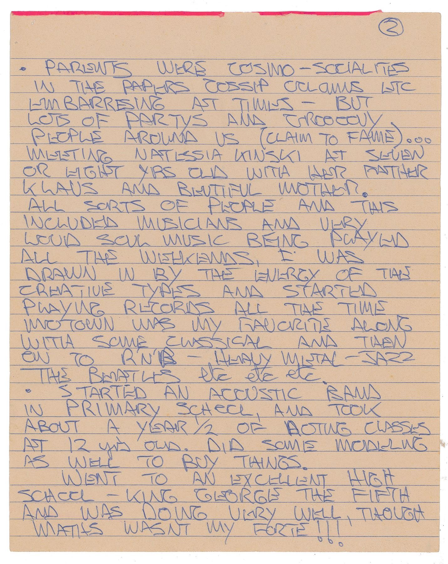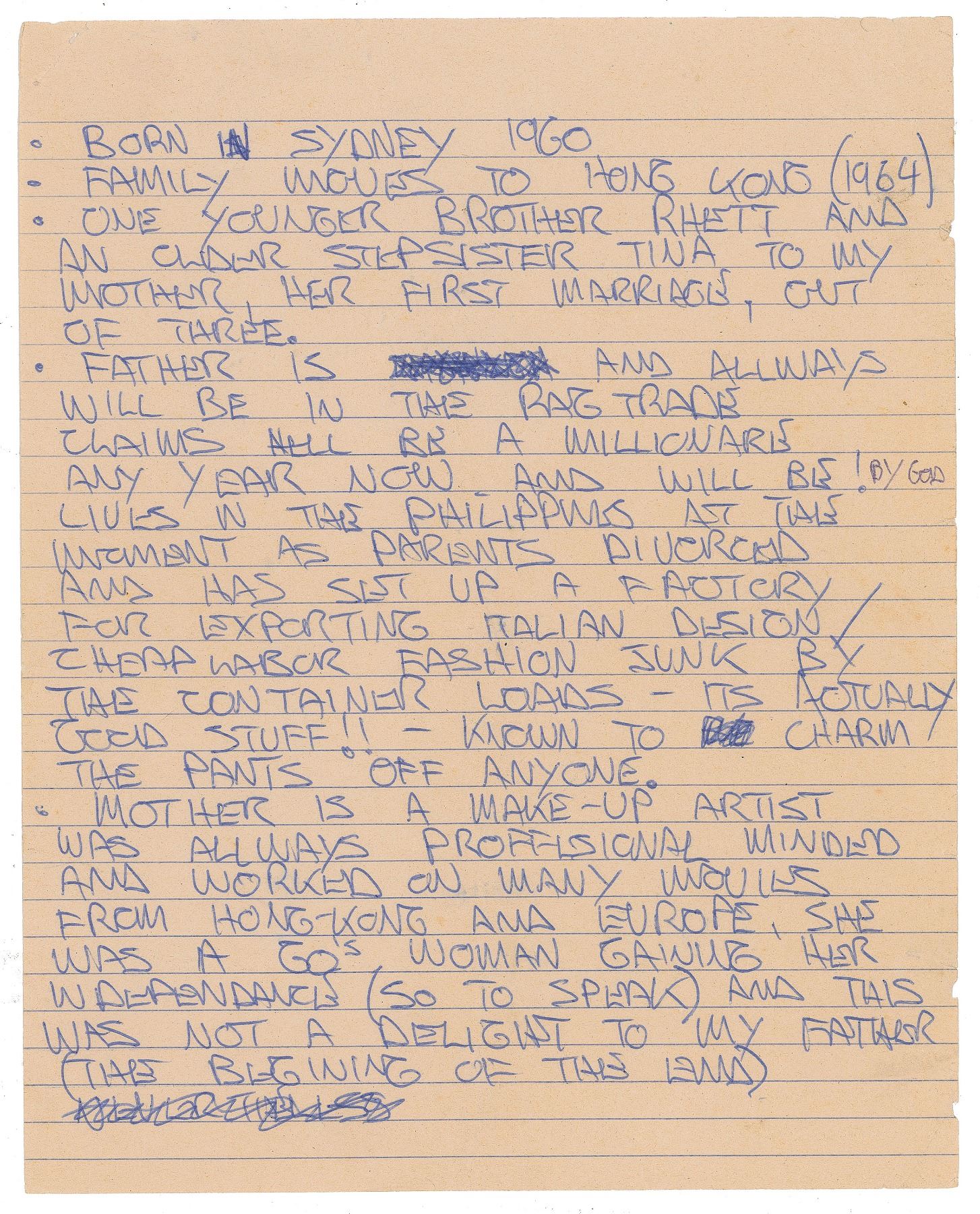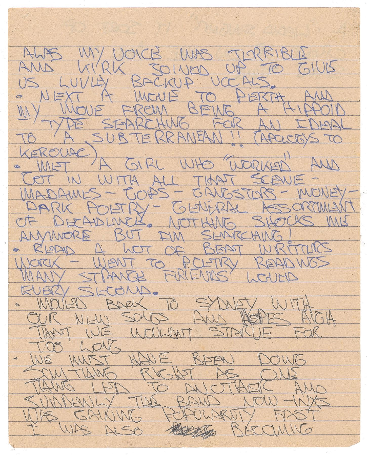Rare handwritten autobiography by INXS lead singer Michael Hutchence, unsigned, no date, penned in ballpoint on five 8 x 10 pages. Hutchence writes about his family and his upbringing, noting his move from Brisbane to Hong Kong and then back to Sydney, his earliest musical endeavors, and his first meeting with Andrew Farriss. In part: “Moved to Sydney again when I was 13—my first day at h-school was shock shock!! Got cornered by the heavies and along comes Andrew Farriss and large friend to stop me from putting shit on everyone in my HK accent and stop the bashing too! Quite a funny meeting that turned into a long friendship. Andrew and I being the sensitive souls we were started making music our prime motive in life and eventually with the help of others recorded a lot of experimental music in garages and living rooms etc.” In fine condition.