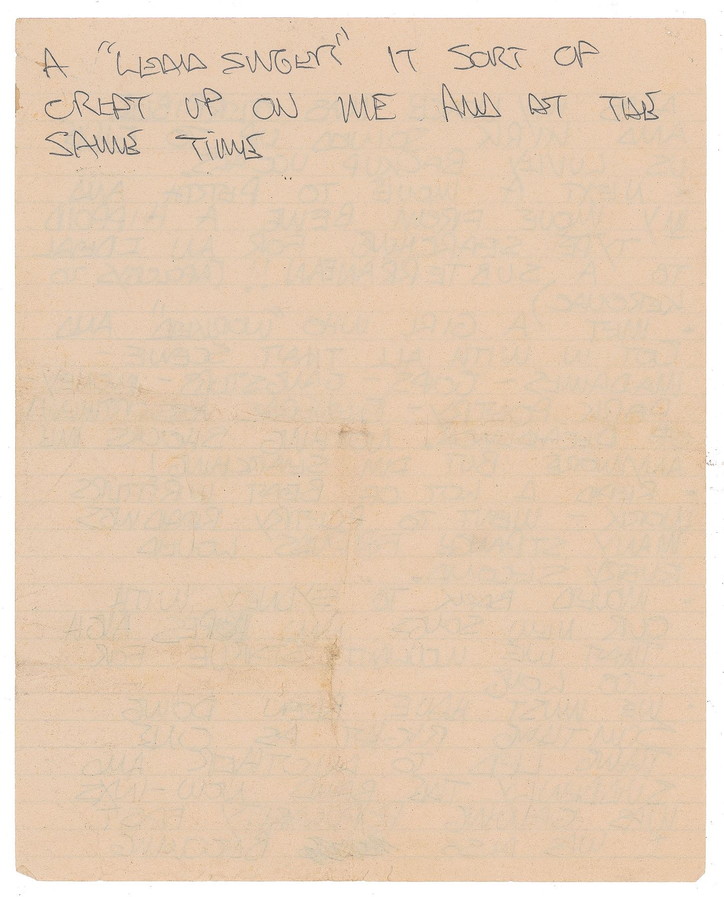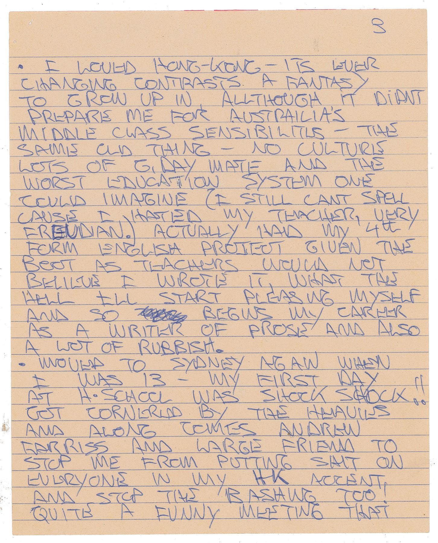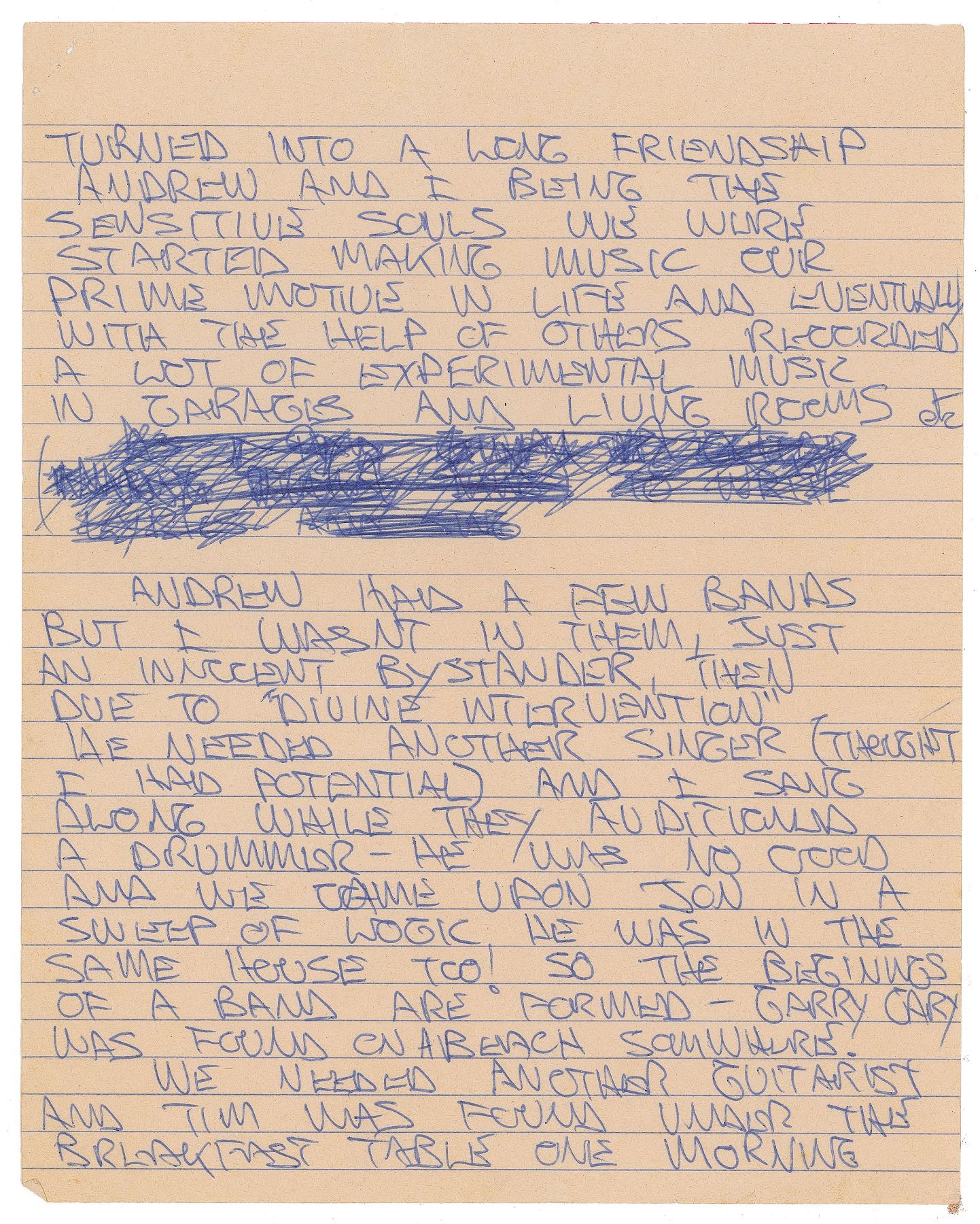 Rare handwritten autobiography by INXS lead singer Michael Hutchence, unsigned, no date, penned in ballpoint on five 8 x 10 pages. Hutchence writes about his family and his upbringing, noting his move from Brisbane to Hong Kong and then back to Sydney, his earliest musical endeavors, and his first meeting with Andrew Farriss. In part: “Moved to Sydney again when I was 13—my first day at h-school was shock shock!! Got cornered by the heavies and along comes Andrew Farriss and large friend to stop me from putting shit on everyone in my HK accent and stop the bashing too! Quite a funny meeting that turned into a long friendship. Andrew and I being the sensitive souls we were started making music our prime motive in life and eventually with the help of others recorded a lot of experimental music in garages and living rooms etc.” In fine condition.