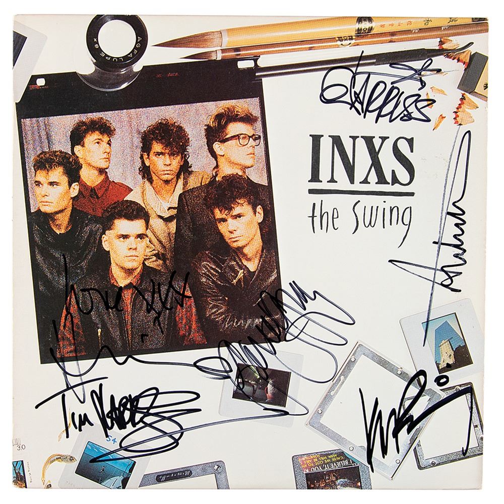 The Swing album by INXS, signed in black felt tip by Michael Hutchence, Tim Farriss, Kirk Pengilly, Garry Gary Beers, Jon Farriss, and Andrew Farriss. In fine condition. The record is included.