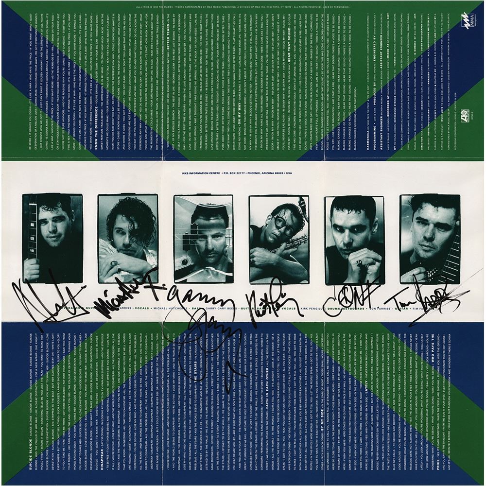 X CD by INXS, signed inside the booklet next to their images in black felt tip by Michael Hutchence, Kirk Pengilly, Garry Gary Beers, and Tim, Jon, and Andrew Farriss. In fine condition. The CD is included. Accompanied by a laminated backstage 'staff' pass for an INXS concert at the Hartford Civic Center in Hartford, Connecticut, on February 26, 1991.