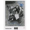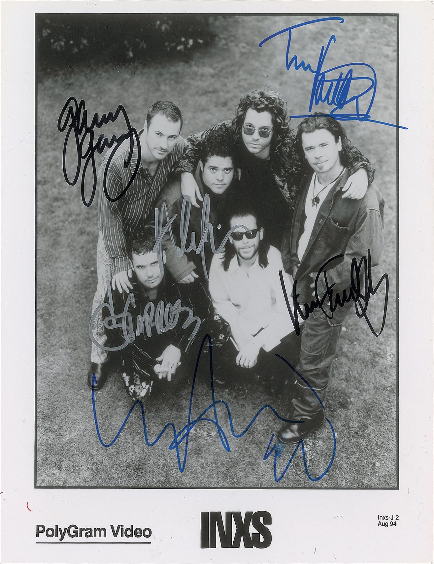 Glossy 8 x 10 PolyGram publicity photo of the classic INXS lineup, signed in various inks by Michael Hutchence, Tim Farriss, Kirk Pengilly, Garry Gary Beers, Andrew Farriss, and Jon Farriss. In very good to fine condition, with scattered light creasing, and two bends to the upper left corner area.