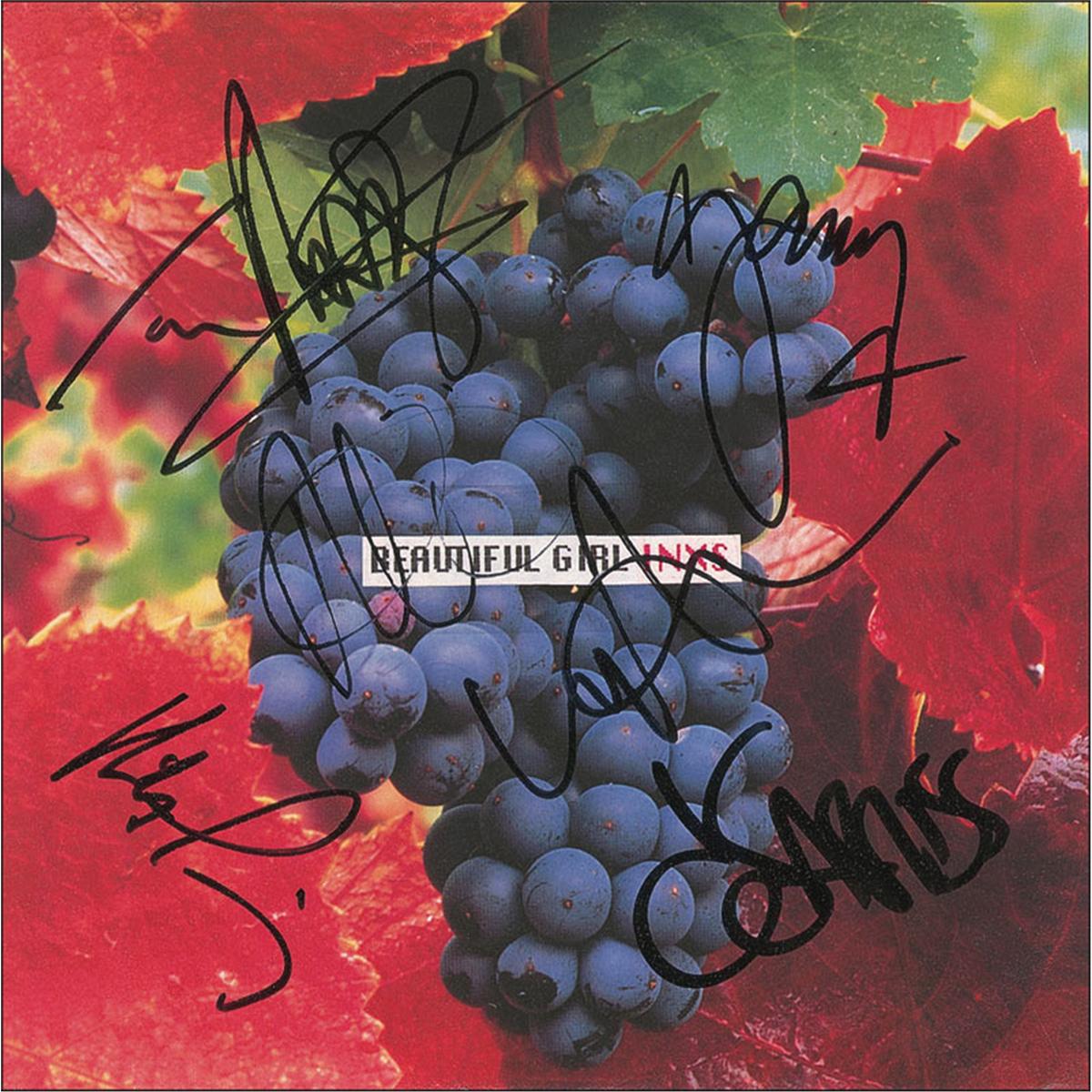 45 rpm record of ‘Beautiful Girl’ signed on the sleeve in black felt tip by all six original members, including deceased lead singer Michael Hutchence. In fine condition, with a light impression to sleeve from record.