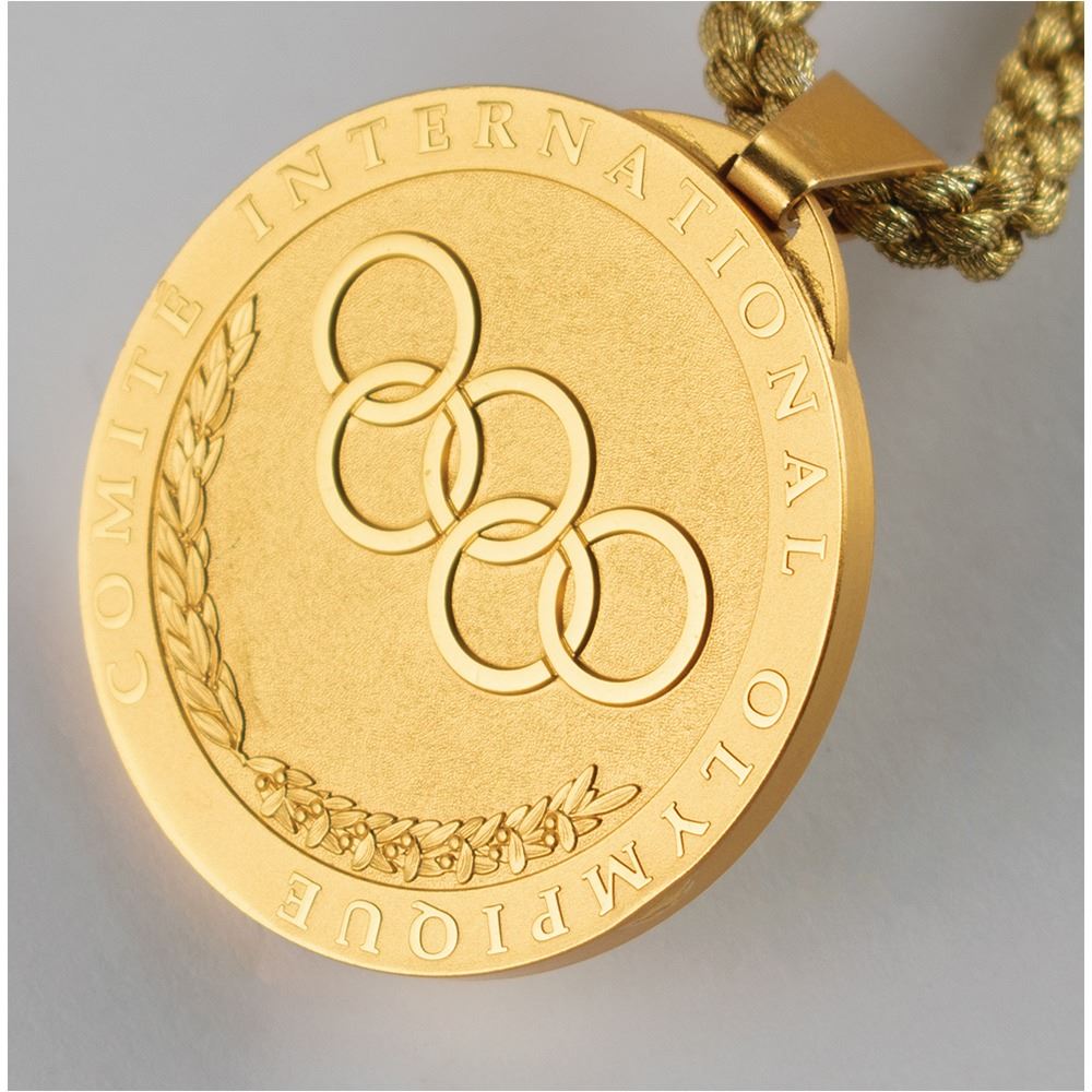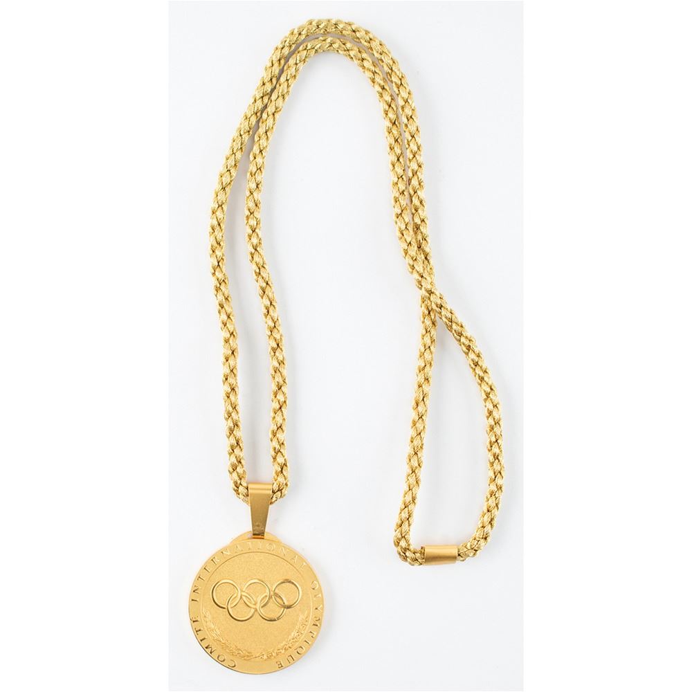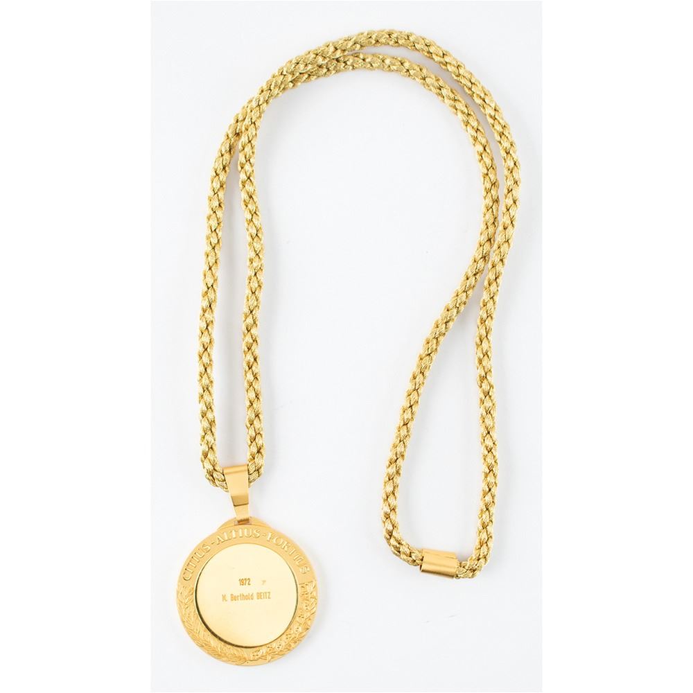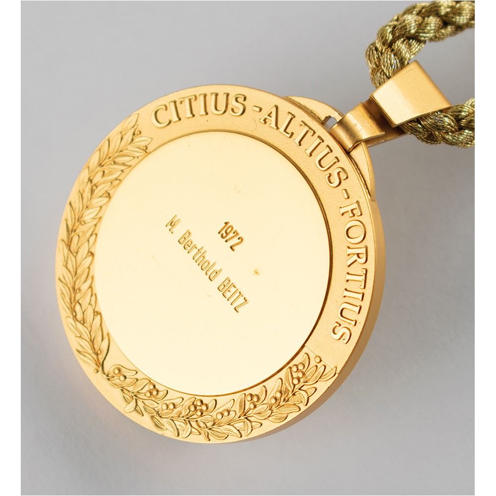 Very rare gold-tone International Olympic Committee (IOC) badge of office, 67 gm, 51 mm; the front is embossed with the Olympic rings and a laurel wreath and encircled with the text: “Comite International Olympiqueâ€; and the reverse bordered with a laurel wreath and the Olympic motto, with the central plaque engraved: “1972, M. Berthold BEITZ.†The badge includes its original golden braid necklace. In fine condition.