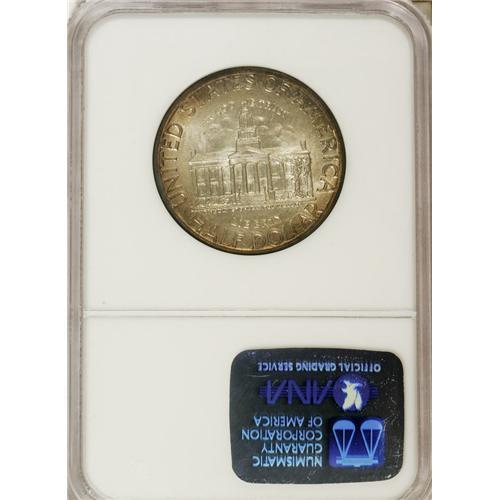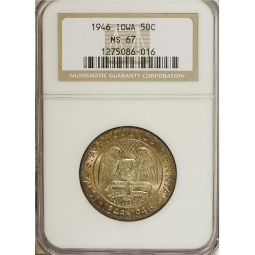<B>1946 50C Iowa MS67 NGC.</B></I> Adam Pietz, previously an engraver with the U.S. Mint, offered the design for the Iowa half from his private practice. This lovely piece has a largely canary-gold obverse and silver-gray reverse surfaces, while the margins have glints of pink and powder-blue.<BR><I>From The Cary & Cheryl Porter Collection.</B></I><BR><BR><b>Shipping:</b> Coins & Currency (<a target="_blank" href="http://www.heritageauctions.com/common/shipping.php">view shipping information</a>)