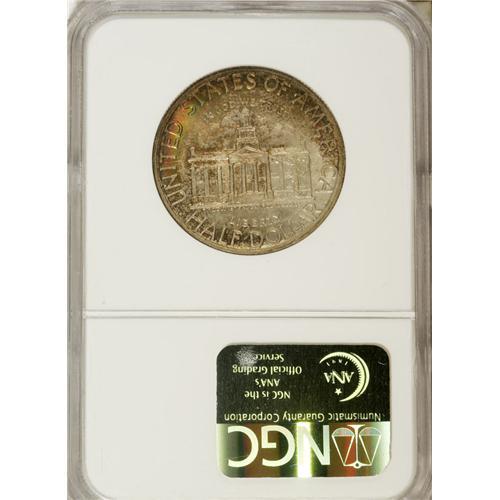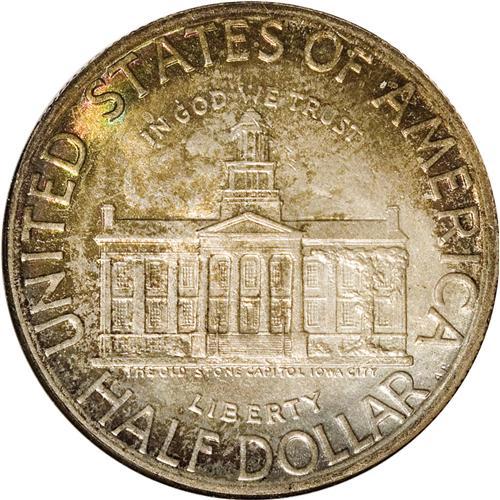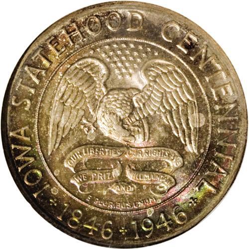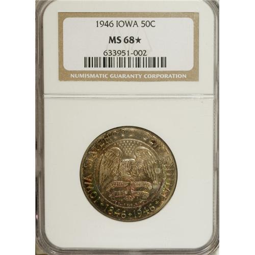 <B>1946 50C Iowa MS68 <img border='0' src='http://www.heritagecoins.com/images/star.gif' width=10 height=10> NGC.</B></I> Though the Medallic Art Company of New York City had handled many of the commemorative dies of the pre-1939 era, the Philadelphia Mint made the final models for the Iowa half. This spectacular example displays silver-gray, magenta, ocean-blue, and lime-green patina on the obverse, while the reverse exhibits bronze toning at the top and lavender-gray color at the bottom. A strongly lustrous and lovely piece. Census: 8 in 68 S, none finer (4/07).<BR><I>From The Cary & Cheryl Porter Collection.</B></I><BR><BR><b>Shipping:</b> Coins & Currency (<a target="_blank" href="http://www.heritageauctions.com/common/shipping.php">view shipping information</a>)