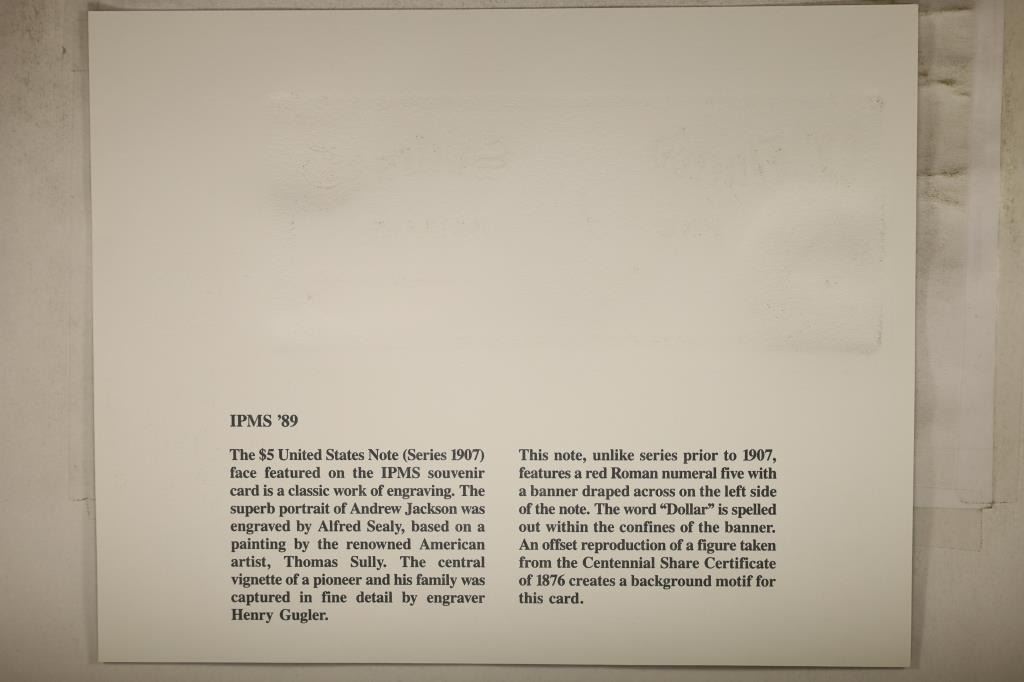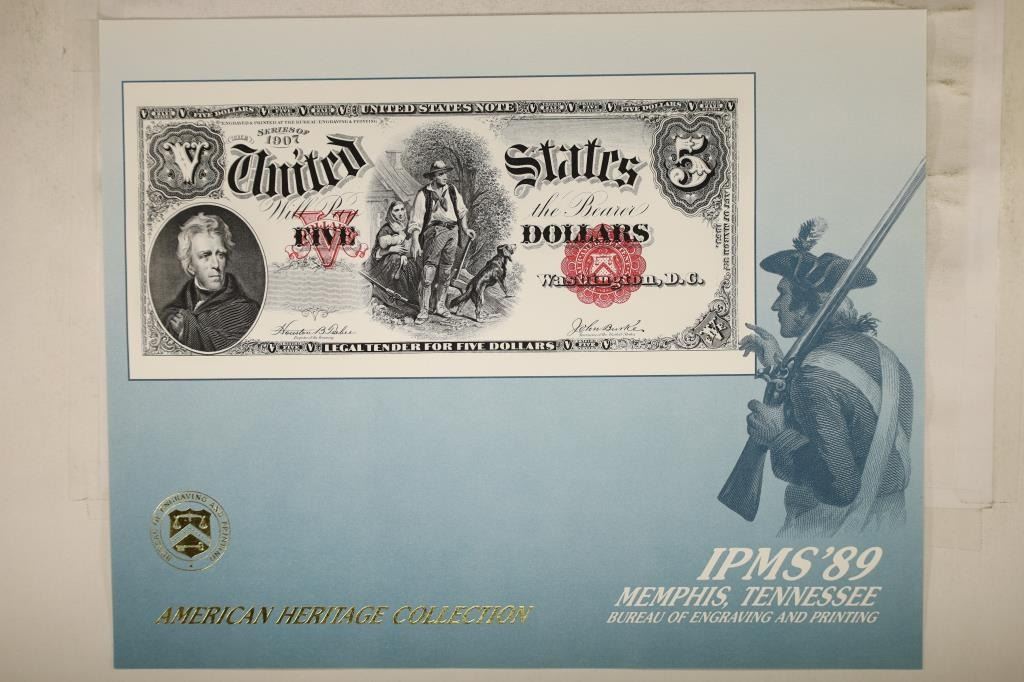 COLLECTION SOUVENIR CARD FEATURING AN ENGRAVING OF THE OBVERSE OF A 1907 SERIES $5 US NOTE, PRINTED BY THE BUREAU OF ENGRAVING AND PRINTING