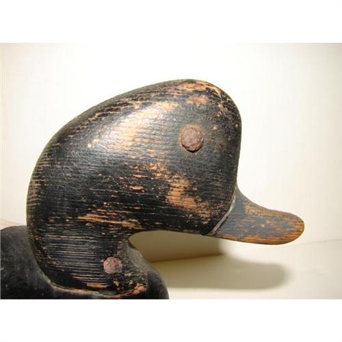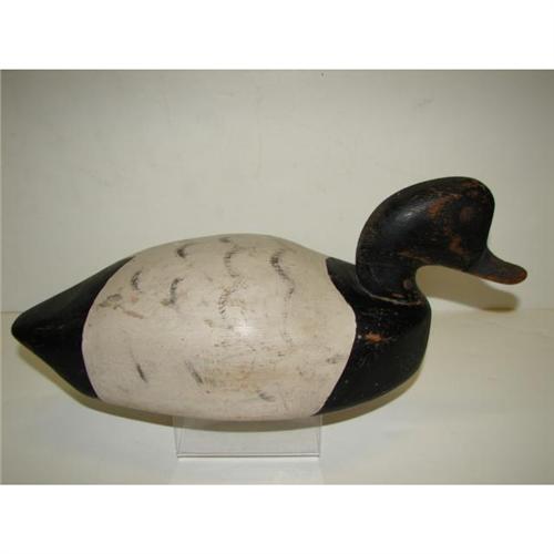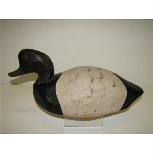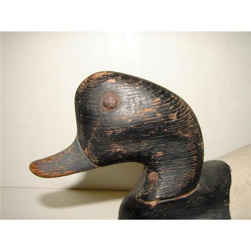 IRA HUDSON VIRGINIA BLUEBILL DECOY. Body with working repaint, head possibly original paint. Tack eyes. Head re-attached. Provenance: Attached tag reads: “Blue Bill Decoy – Gift from Gene Bunting (Sec. State of DE). Came from Bunting’s Hunting Lodge on Assateague Island 1970s. – Belonged to Gene’s Dad.” 14.5” long.