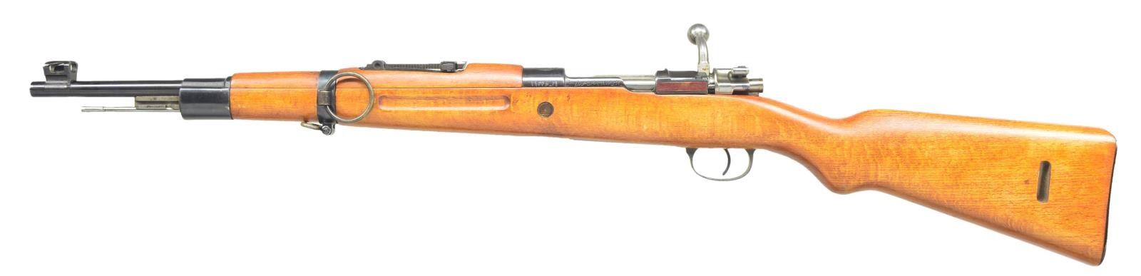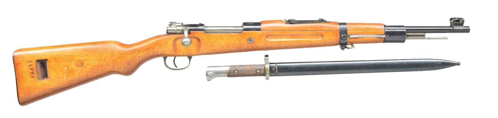 Cal. 8mm Mauser. S #19346-29 (Translated from Farsi). Bbl. 18". All matching Farsi numbers. Receiver ring has Persian lion crest. Left receiver side rail has Farsi markings. Turned down bolt handle. Tangent rear sight w/ Farsi graduations. Inverted V front sight w/ protectors. Cleaning rod is present. Bayonet bar present. Rear band has vacant screw hole on right side. Bottom mounted front sling swivel & left side sling ring. Hardwood beech stock. UNATTACHED ACCESSORIES: 98/29 bayonet w/ scabbard. Hilt marked w/ Farsi writing. Metal parts of bayonet remain mostly bright w/ some fine oxidation and dried grease. Wooden grip panels show dings and handling marks. Scabbard retains most of its arsenal blue finish w/ some light silvering & scratches. CONDITION: beech stock lightly refinished w/ added varnish. Metal retains 90% arsenal rework blue with some silvering on buttplate & scattered light handling marks. Very good bright bore. (22-2380/MJC). CURIO. $300-500.
