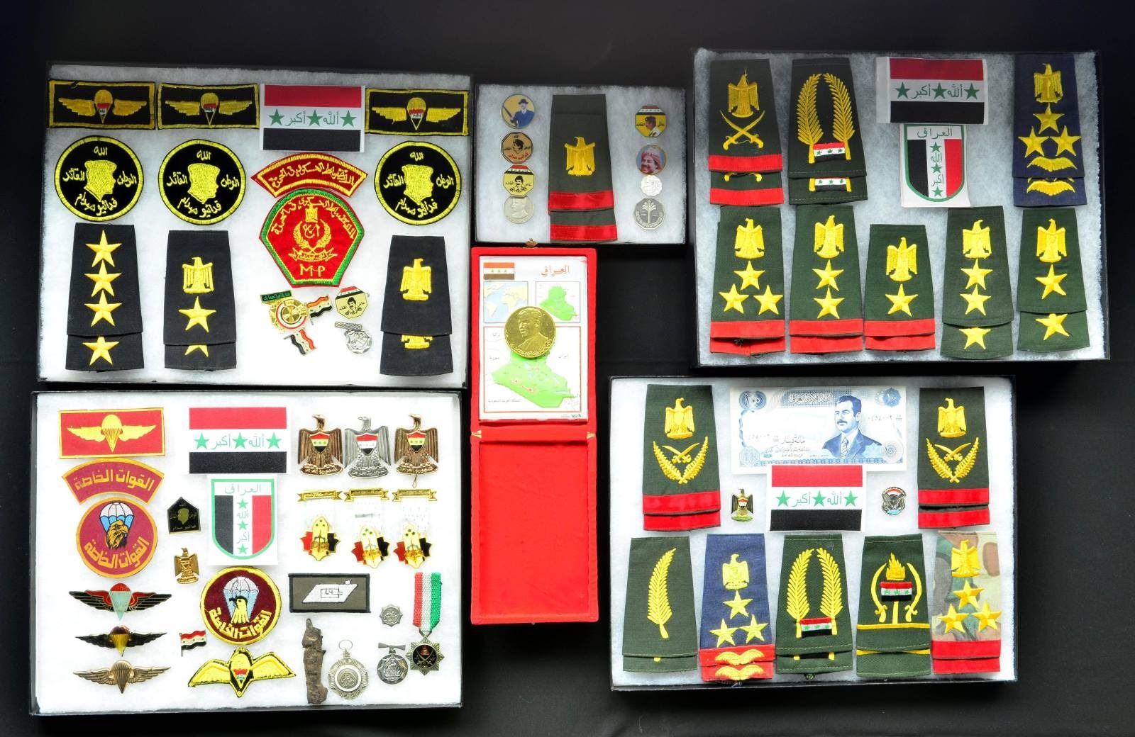 1) Two 16" x 12" framed displays w/ various cloth & metal uniform attachments. 2) One 6" x 8" framed display of pins showing Saddam Hussein along w/ coins & shoulder board set. 3) Two 16" x 12" framed displays containing 2 pins, paper currency w/ Hussein's photo & various shoulder boards. 4) Red velvet display case w/ maps of Iraq & golden coin having bust of Hussein. 5) Formed leather powder flask appearing able to hold 2/3+ lb. powder plus very aged leather pouch having flat oval shape & likely able to contain 1/4 lb. powder. 6) Copper Iraqi coin w/ descriptive card in Farsi. 7) Light tan Iraqi backpack in good condition. (02-16464-1/NW). $400-800.