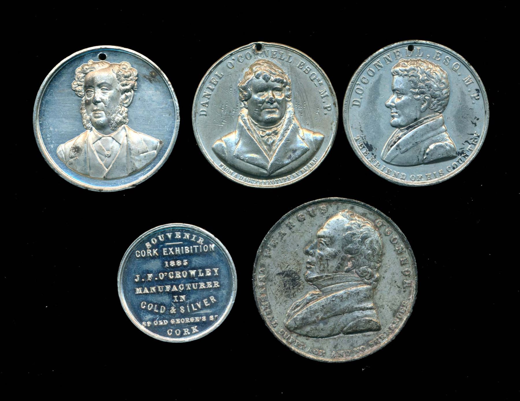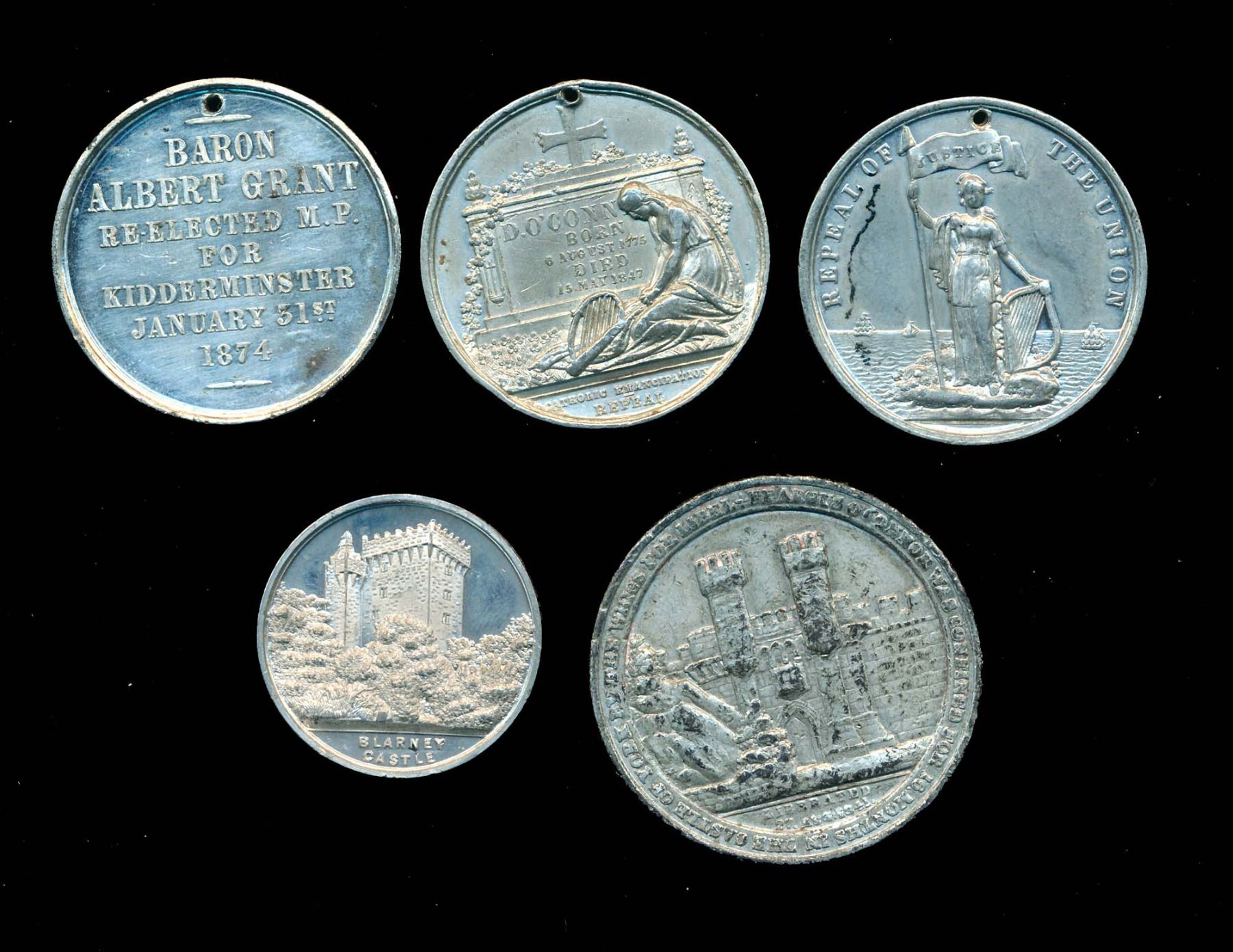 Daniel O'Connell 1775-1847 Death Medal WM-38 18.6 gms. Edge: Plain Fine Pierced, Same, Repeal of the Nation Medal WM-38 19.8 gms. Edge: Plain Very Fine+ Pierced, Feargus O'Connor 1841 WM-42 22.4 grams Edge: Plain Imprisioned at York Medal Fine, Baron Albert Grant (Abraham Gotthiemer) 1874 Election Medal 15.5 gms. Edge: Plain Very Fine Pierced & J.F.O'Crowley 1883 Cork Expo Store Token WM-31 9.8 gms. Edge: Plain Extra Fine+ RARE