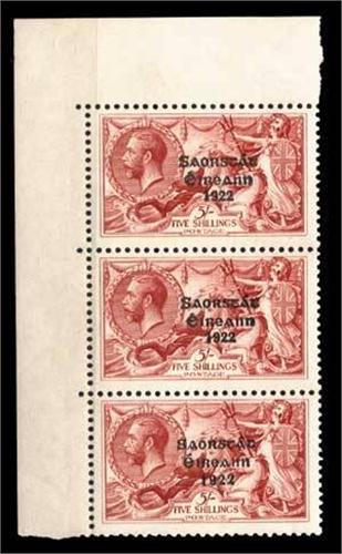1925-28 Govt Ptg Works 5s rose-red (SG 84a) NE corner vert strip of 3 incl two narrow date and one wide date stamps (N,N,W) a couple of shortish perfs at foot and odd gum bend, u/m
