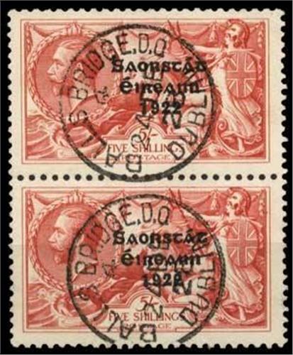 1925-28 Govt Ptg Works, wide date, 5s rose-red (SG 87) vert pair very fine used by Balls Bridge/Dublin cds for 24 De 28