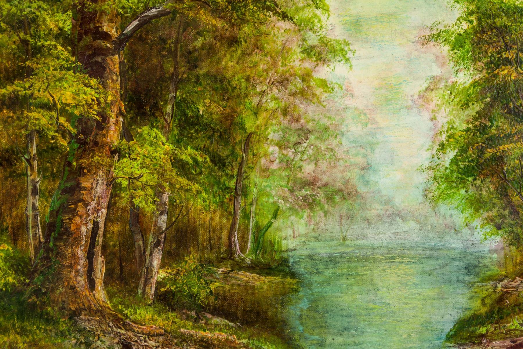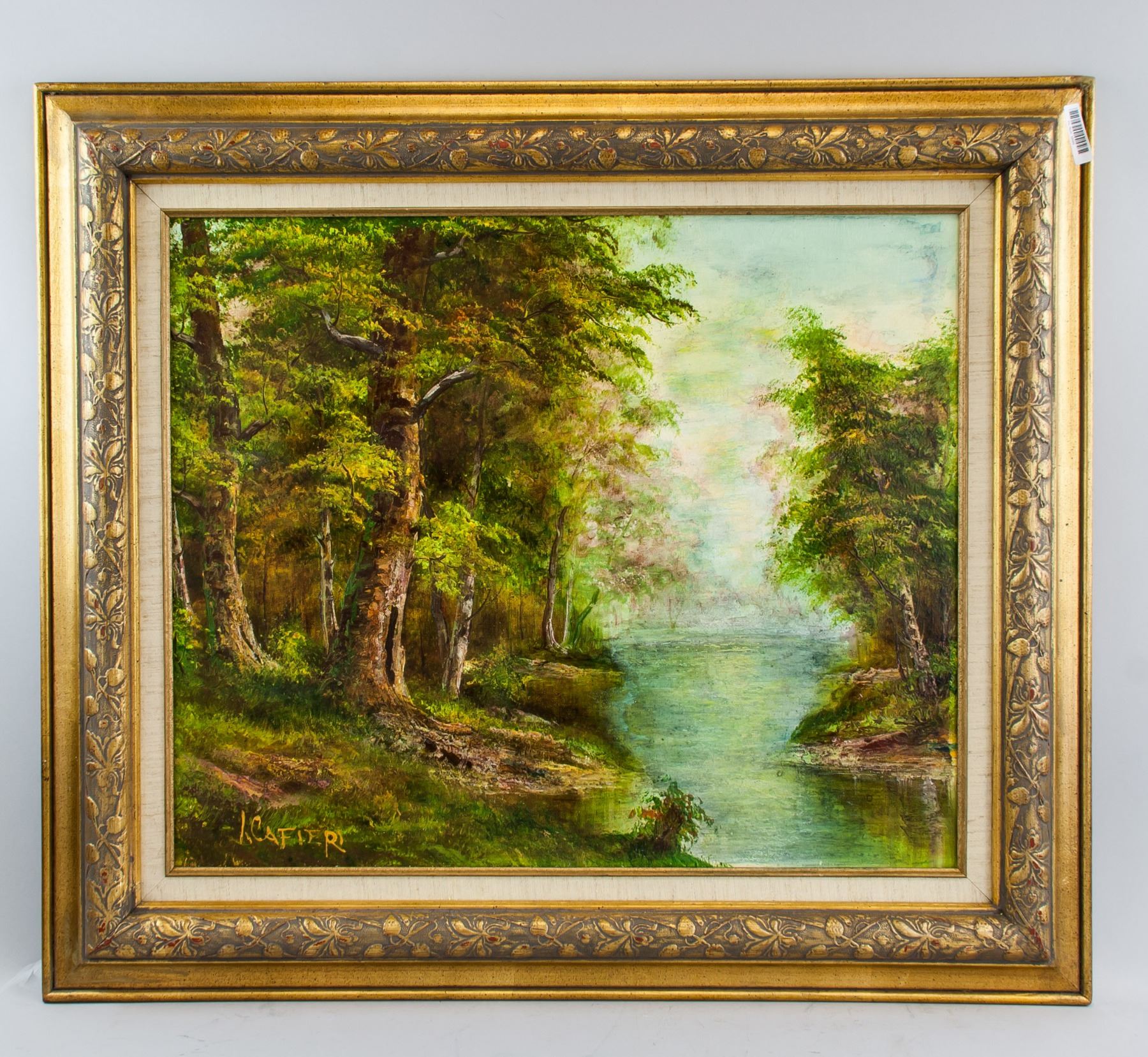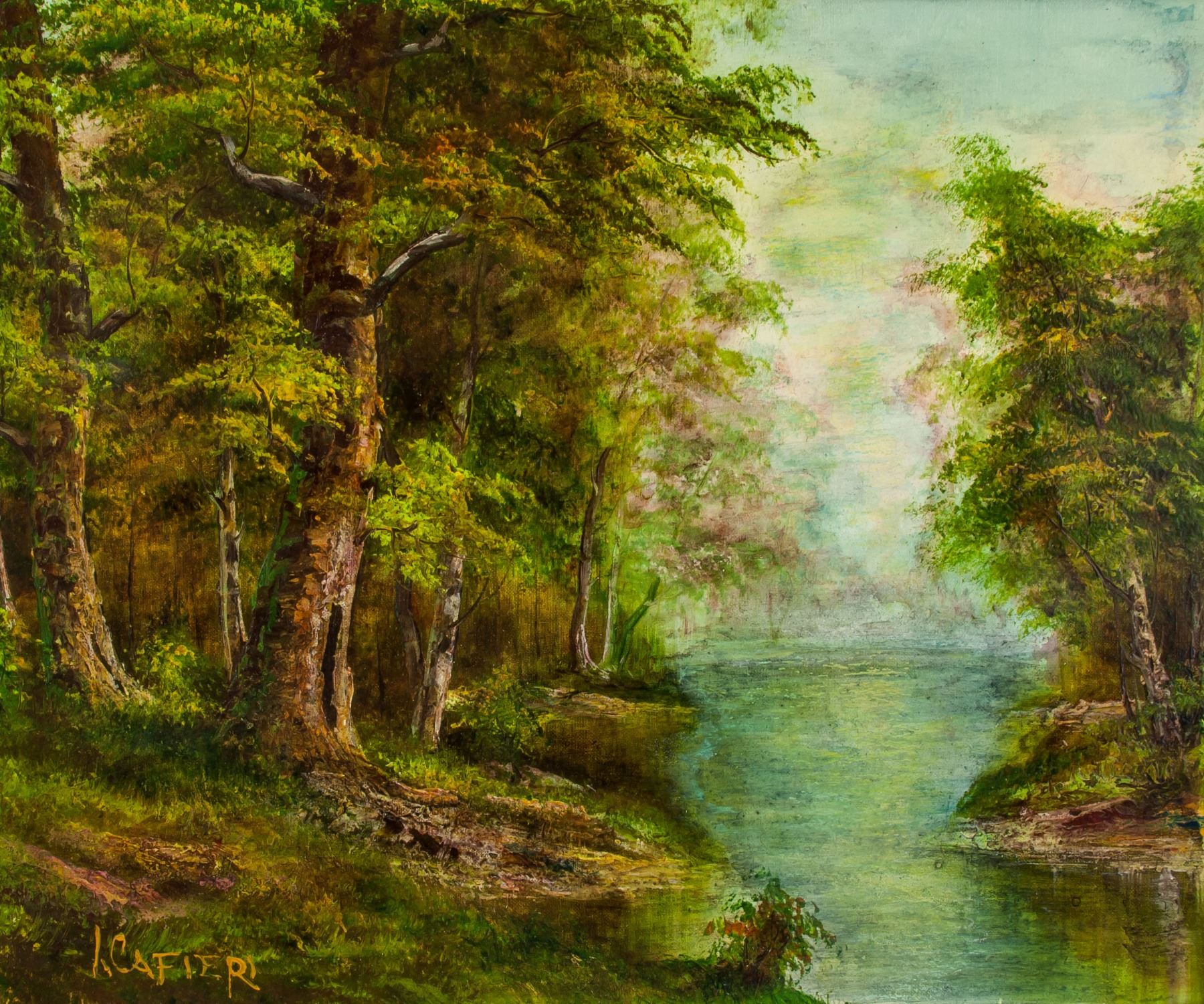 oil on canvas, featuring forest landscape, signed and attr Irene Cafieri on the lower left corner, 19.3 x 23.2 in. (49 x 59 cm)