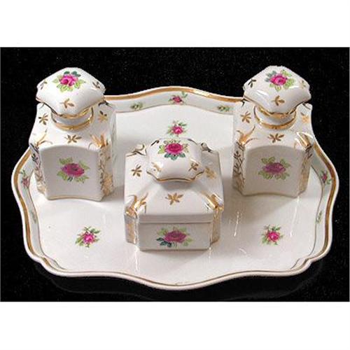 Produced and imported by I. Rice from Germany during the 1930s or 1940s and marked - An IRICE Product - Hand Painted. This dresser set, made in lovely porcelain consists of two perfume bottles, a powder jar, and a tray all copiously decorated in gold and hand painted purple, yellow and green flowers. The square shape with curved sides and corners are reminiscent of SEVRES styling. The bottles measure 4 1/2 inches tall x 2 1/2 inches across the base - the jar 3 1/4 x 3 1/4 inches and the tray 12 x 10 inches. With the exception of some wear to the gold, due to age, bottles, their stoppers, the jar, its lid and the tray are all in excellent condition.