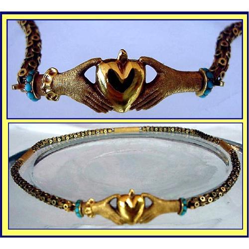 Victorian 18 K gold and turquoise love / friendship necklace. This necklace originated in Ireland in the mid 1900's, it is referred to as the Cladagh emblem and represents the Irish who emigrated during the famine years.<BR>Measures 17 1/4 inches long when open and weighs 0.7oz on postal scale.<BR>Exceptional workmanship of chain, which concertinas - expanding and contracting when gently pulled. Consists of round disks with openwork stars closely woven with very finely ridged long links that glide over each other. Intersperced with solid round tubular gold links, also finely textured. The necklace opens/closes in the front. A pair of arms, below the elbow, one with a ruffled moulded bracelet/cuff and both with turquoise beads, the open hands holding an apple or heart in classic symbolism for friendship and love.<BR>No visible marks (like much Victorian jewelry), but guaranteed 18K gold.<BR>Good condition.