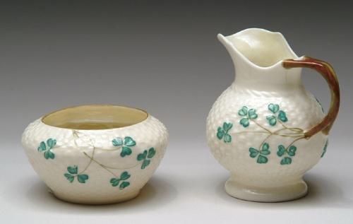 IRISH BELLEEK SHAMROCK PATTERN SUGAR AND CREAMER. Black mark to both. Green shamrocks on a basket pattern mold. SIZE: Creamer is 4in. h, sugar is 2in. h. CONDITION: Very good. 9-25758-3