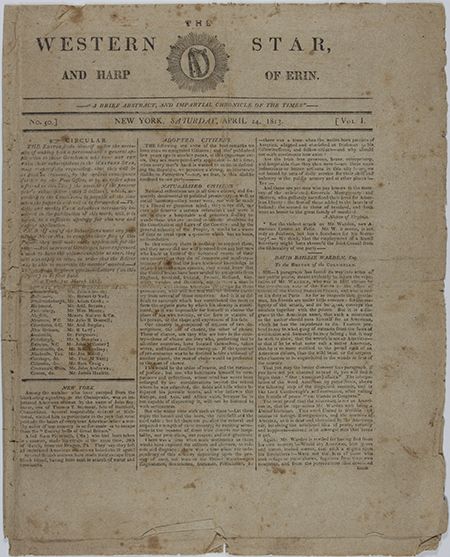 A scarce issue of the short-lived Irish American newspaper, The Western Star and Harp of Erin for Apr. 24, 1813, (New York), 8pp. sm. folio. uncut. The paper was the second attempt at an Irish-American newspaper in New York and only ran from 1812 to 1813 (the first attempt being the Shamrock which ran for a brief period in 1810). This issue includes news on the War of 1812 as well as lists of newly naturalized citizens and more good content. Light scattered foxing, marginal wear, heavy folds, else good condition.