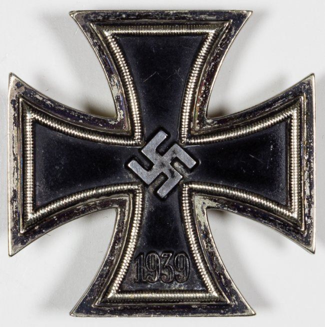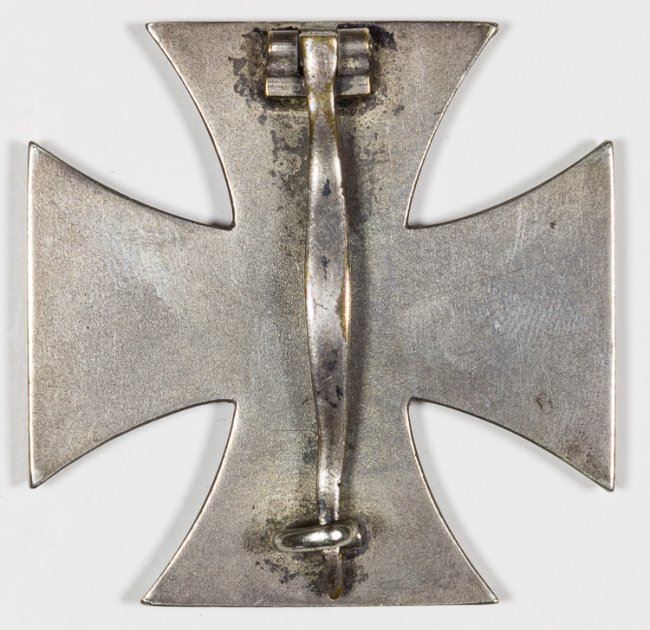 Iron Cross, 1st Class, unmarked. Paint on swastika is worn a bit, the pin on reverse bent and a little loose. Tarnished, else good to very good.