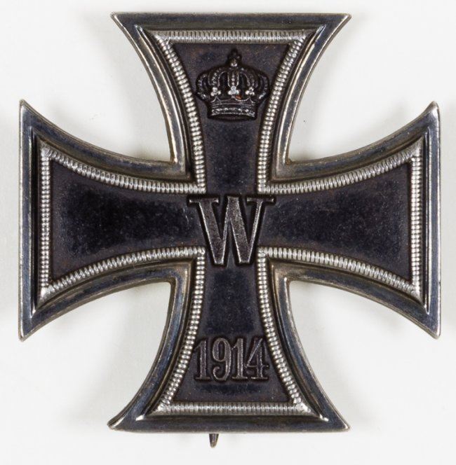 World War I-issue Iron Cross, 1st Class, beveled pin on reverse, unmarked. Paint remains very good with only the slightest wear on the crown, two points on the arms are slightly bent, heavy tarnish, else very good.