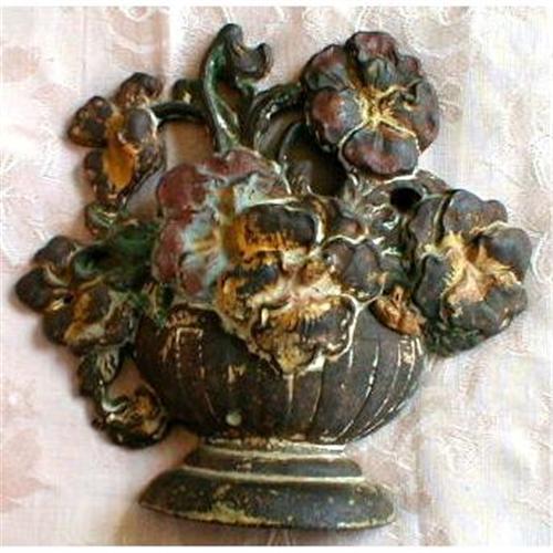 Heavy antique cast iron door stop. Pansies in a bowl.
