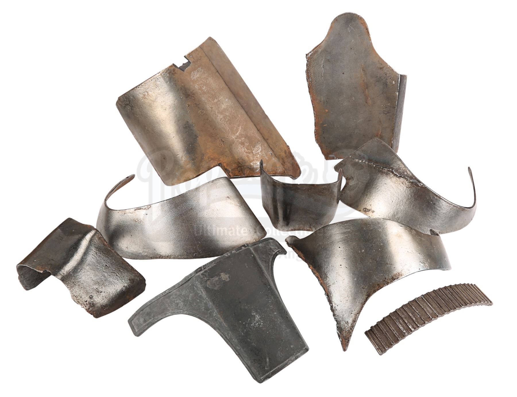 The lot consists of nine assorted armour pieces, all made from a combination of fibreglass and resin. Each component is finished in dark metallic grey shades, with intentional weathering applied to produce the appearance of worn metal. Heavily distressed for the production, the armour pieces display cracks and dust remnants, and one piece exhibits an obvious chip. Dimensions (largest piece): 36.5 cm x 27 cm x 9.5 cm (14 1/2" x 10 3/4" x 3 3/4")