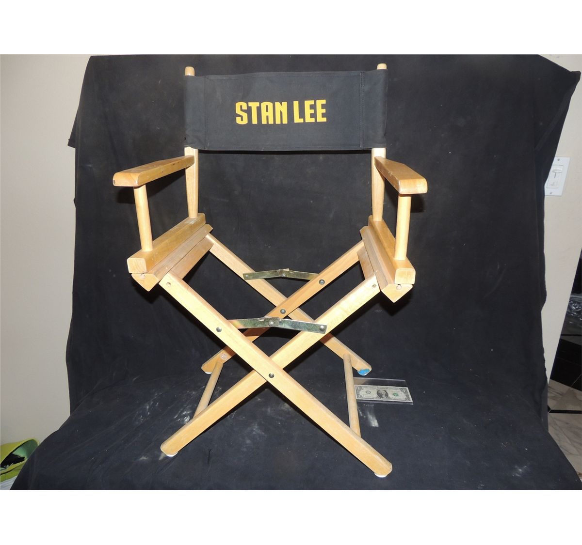 This is Stan Lee's personal used Director's Chair he sat in during the filming of IRON MAN! It does have the seat section, but I forgot to put it in when taking photos. There is damage to one rung at bottom as seen in photos. That dowel should be replaced if you intend to sit in this, but I would leave it as is because that shows the use on set.