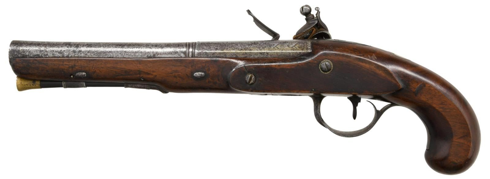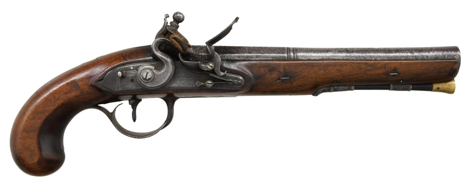 OF BRISTOL. Cal. 66 S# NSN. The 9-1/8" barrel transitions from octagon to round to flared muzzle with wedding band. Top flat is engraved "BRISTOL". There are Birmingham proofs on top left flat. Chamfered lock with rebated tail and serpentine cock has integral rounded pan, bridled friction frizzen and feather spring with bulbous finial. A safety is fitted which engages at half cock. Lock is engraved with double line borders and "JEFFREY" is at center (there are many gunmakers by the name of Jeffrey listed, none of which date to the time this gun was made or Bristol address). European walnut stock extends to muzzle and attaches to barrels with two captive side bolts without escutcheons. Bag grip without cap has chamfered sides. Double beaded trigger guard is of iron and has fancy pineapple finial surmounted by an urn. Ebony ramrod with brass tip mounts through single beaded pipe and matching thimble. CONDITION: good. Iron parts with cleaning to salt and pepper gray patina. Stock with old oil refinish shows some cracks. Bore is lightly pitted. Lock is operable. (01-24067/MGM). ANTIQUE. $1,000-1,500.