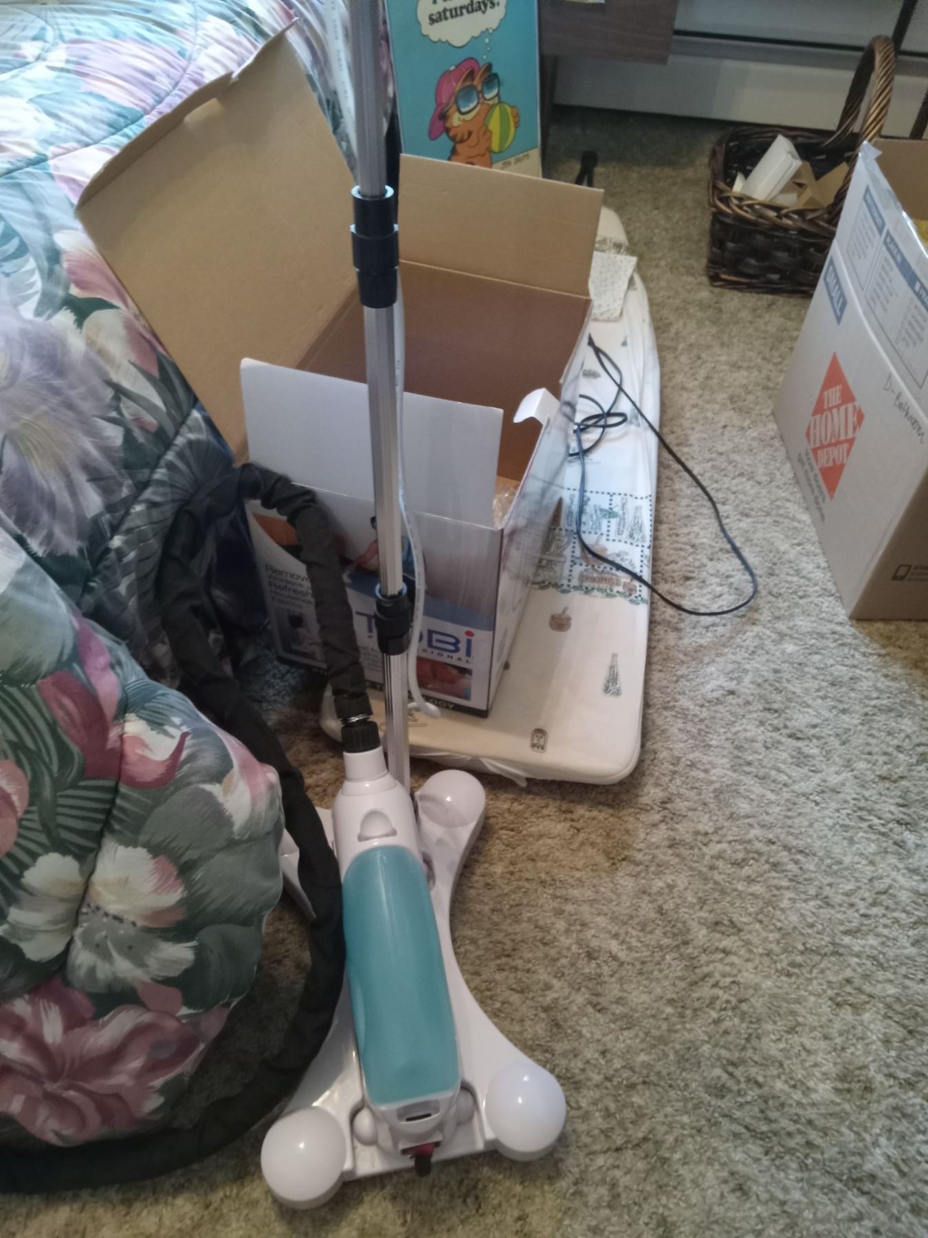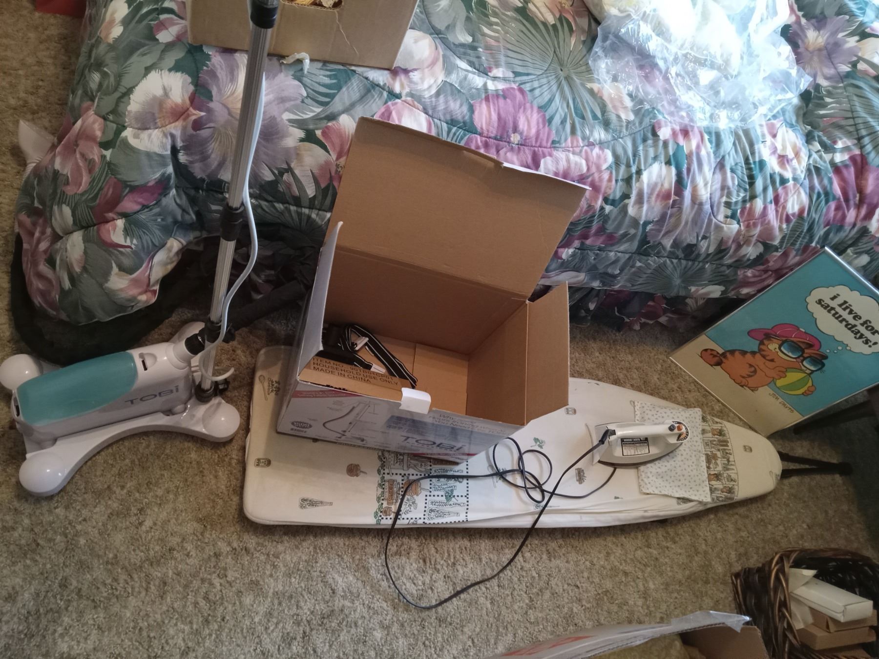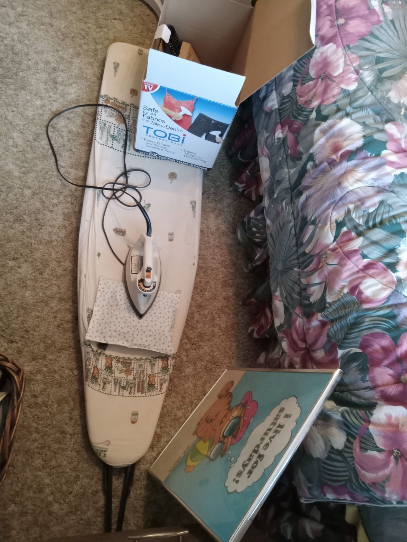 IRONING BOARD/IRON/TOBI PROFESSIONAL FABRIC STEAMER w/ MANUAL & ATTACHMENTS. GARFIELD POSTER in FRAME.
