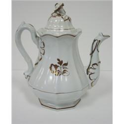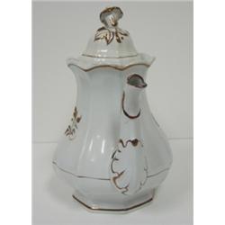 Ironstone floral decorated covered teapot. Illegibly stamped on bottom. Hairline crack visible on bottom measuring 4.5". 9.5" H
