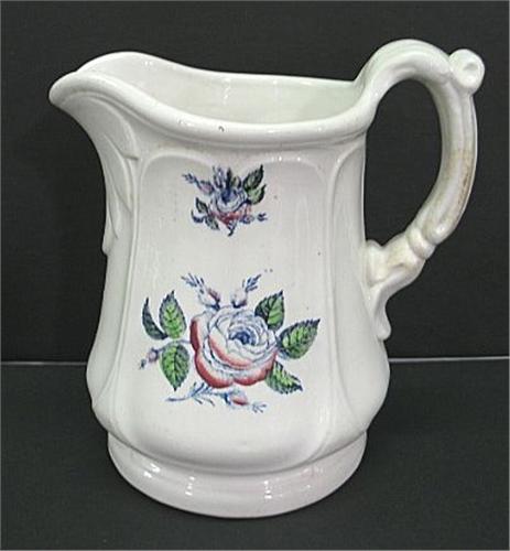 FLORAL DECORATED IRONSTONE PITCHER. No mark. 8” H
