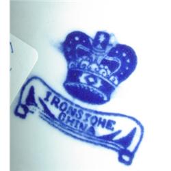 IRONSTONE WASHBOWL & PITCHER IN THE AMARI STYLE. Marked on bottom "Ironstone China" with blue king's crown marking. Pitcher has figural reptilian handle. Pitcher: 8.5" H, washbowl: 11" Dia, 3.5" H