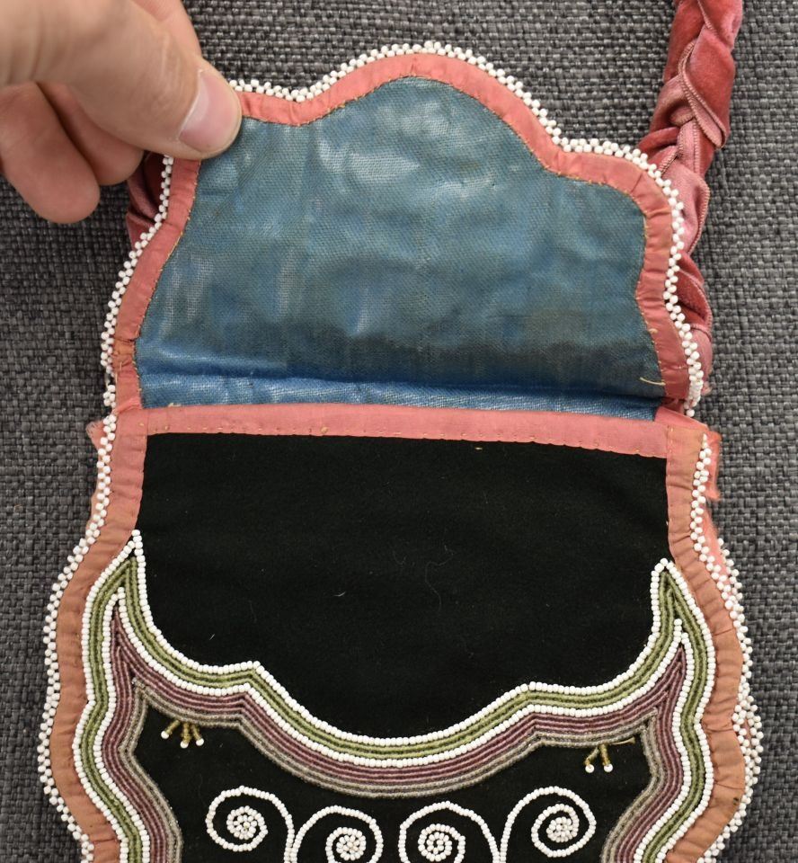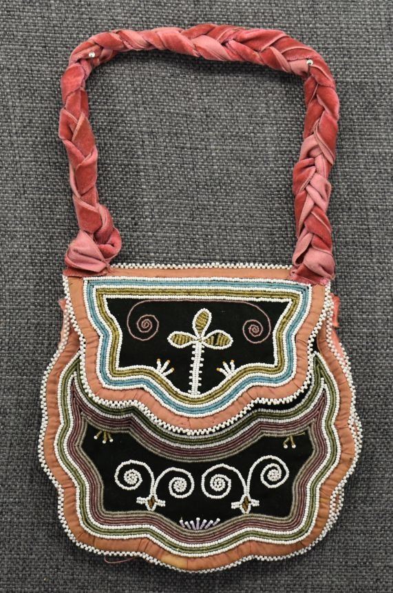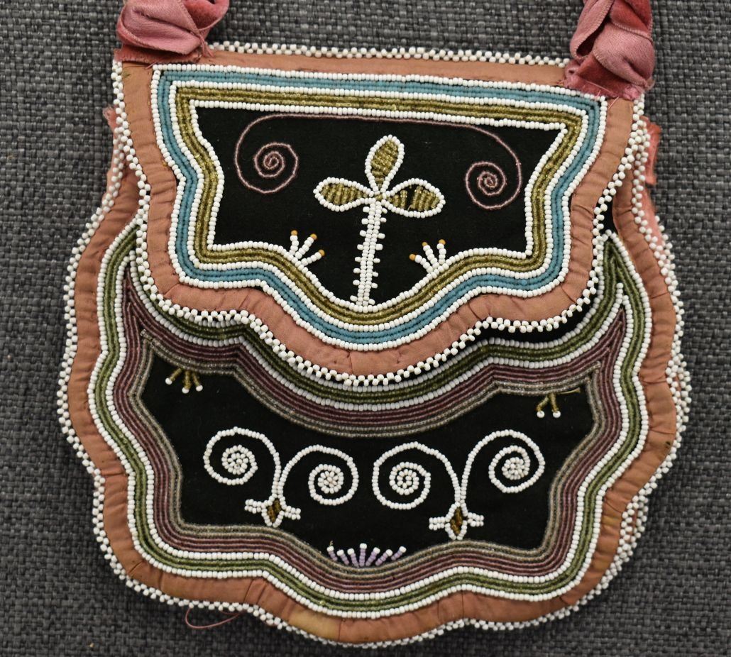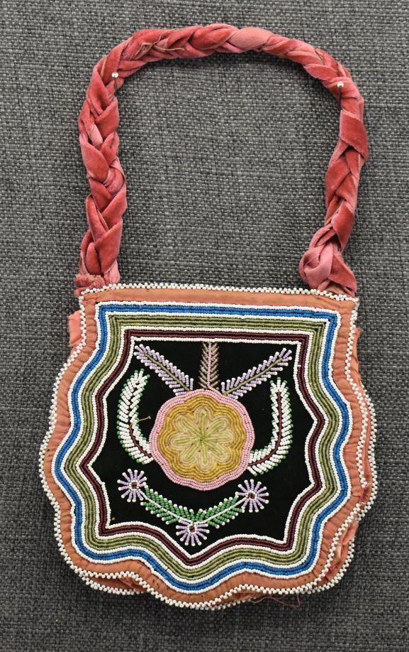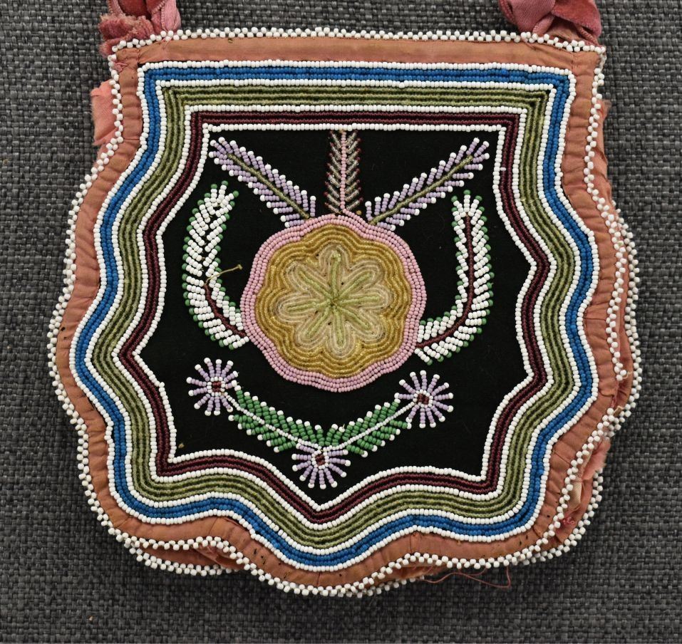 19th century Iroquois, hand made from fabric with beaded on both sides floral design 6" x 6" excluding handle