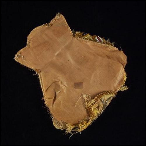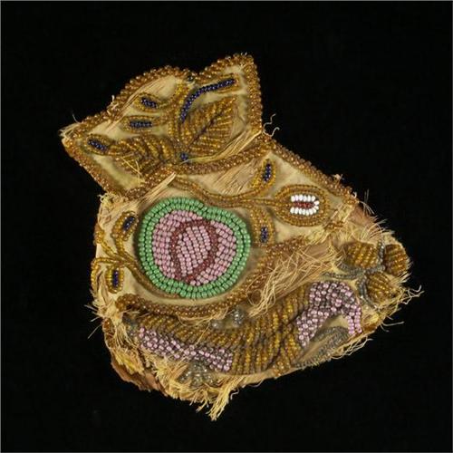 BEADWORK: Haudenosaunee (Iroquois) beaded one-flap purse fragment with characteristic 'puffy' floral beading rendered in small early pony beads including some 'greasy green' and 'Cheyenne pink'. Possibly mid-19th c. Note losses.