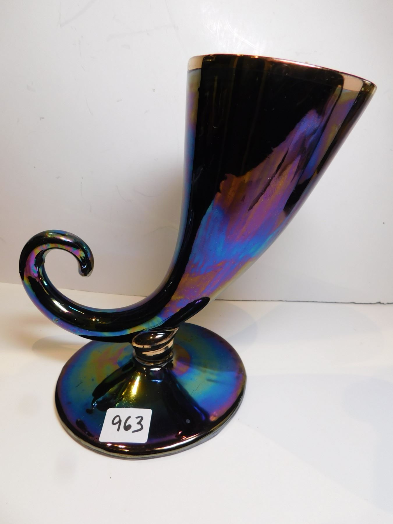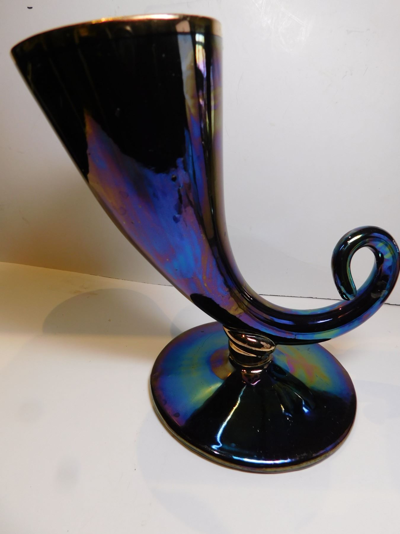 IRRIDESCENT COBALT BLUE LUSTRE, HORN VASE, MADE IN ENGLAND